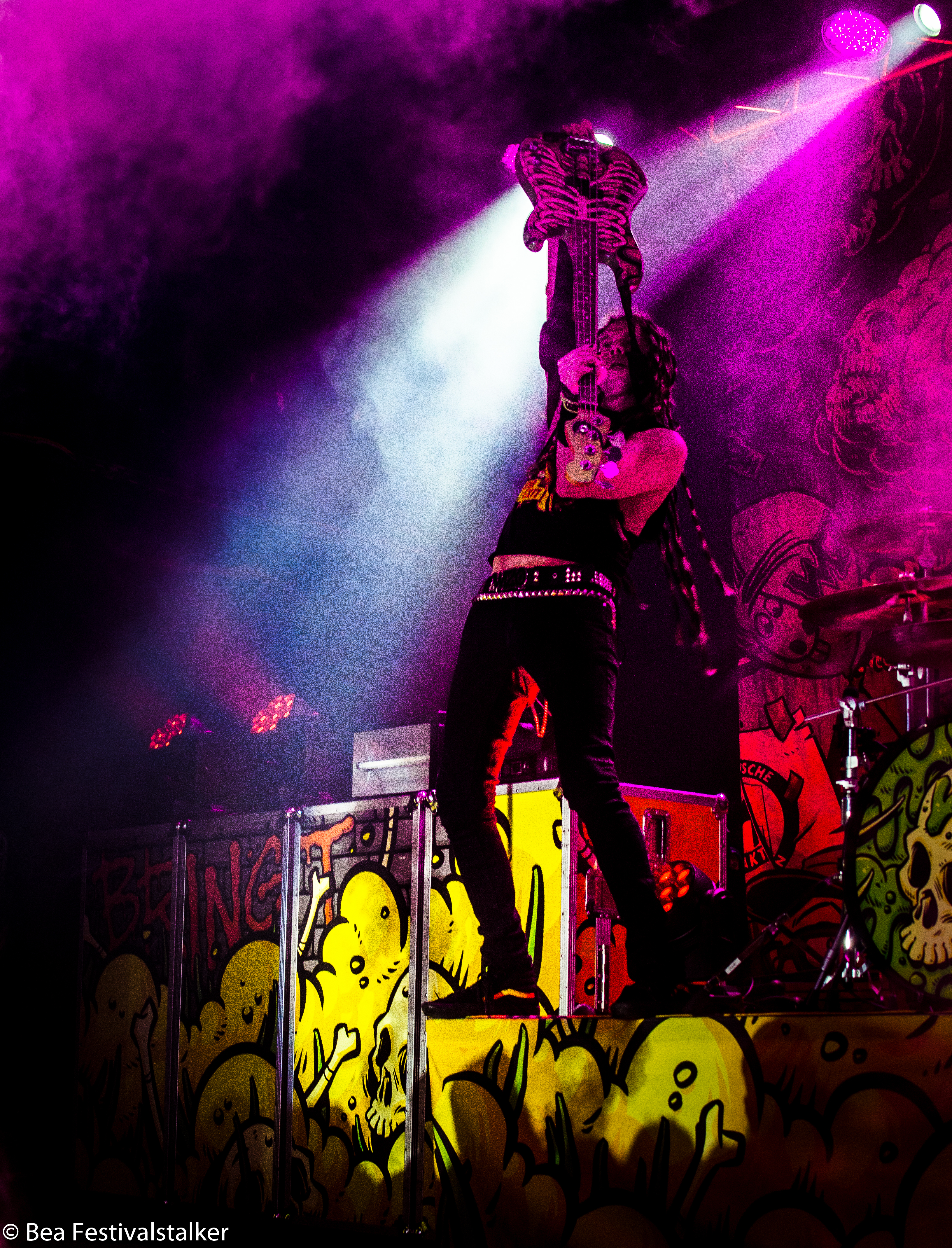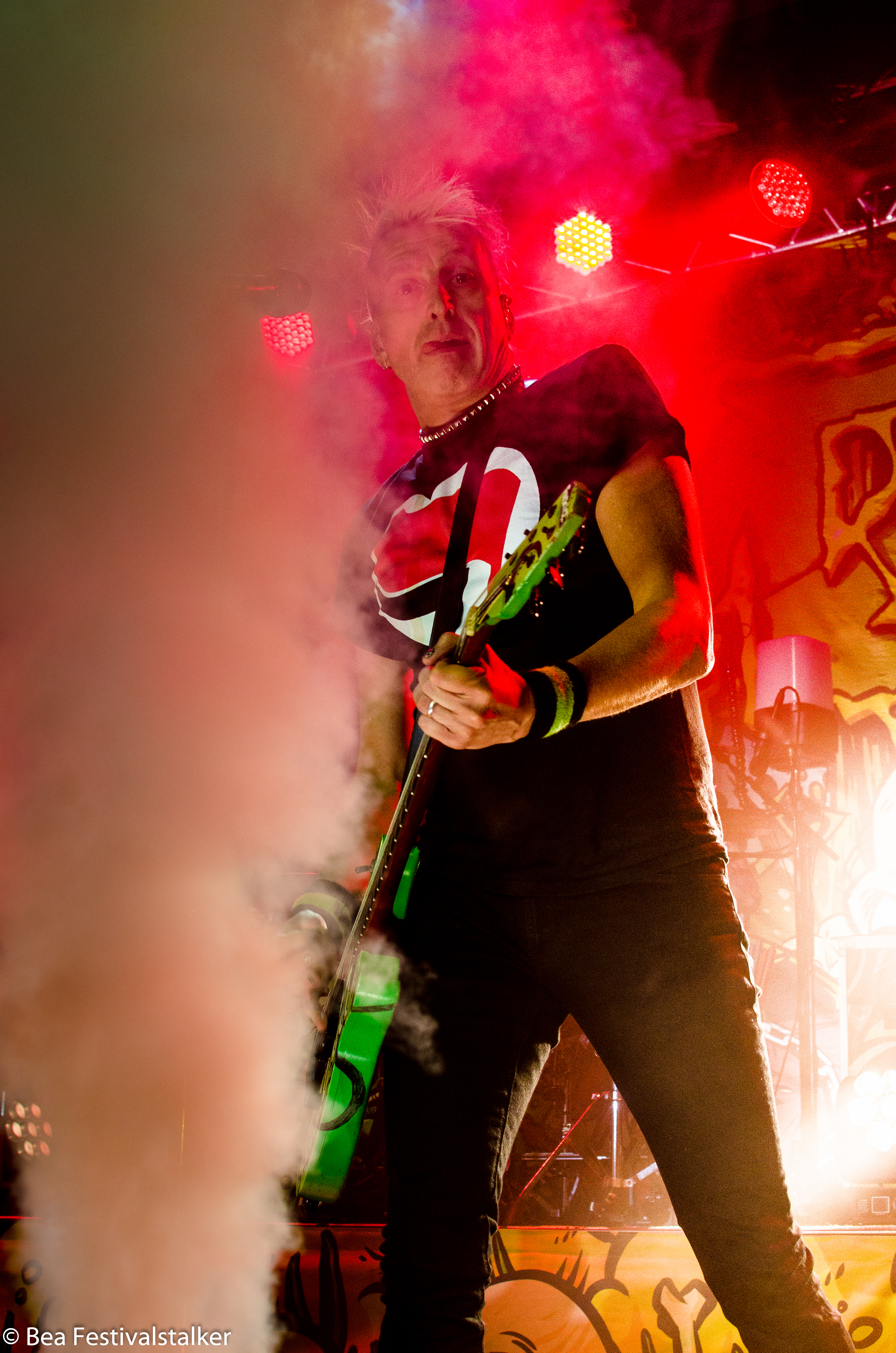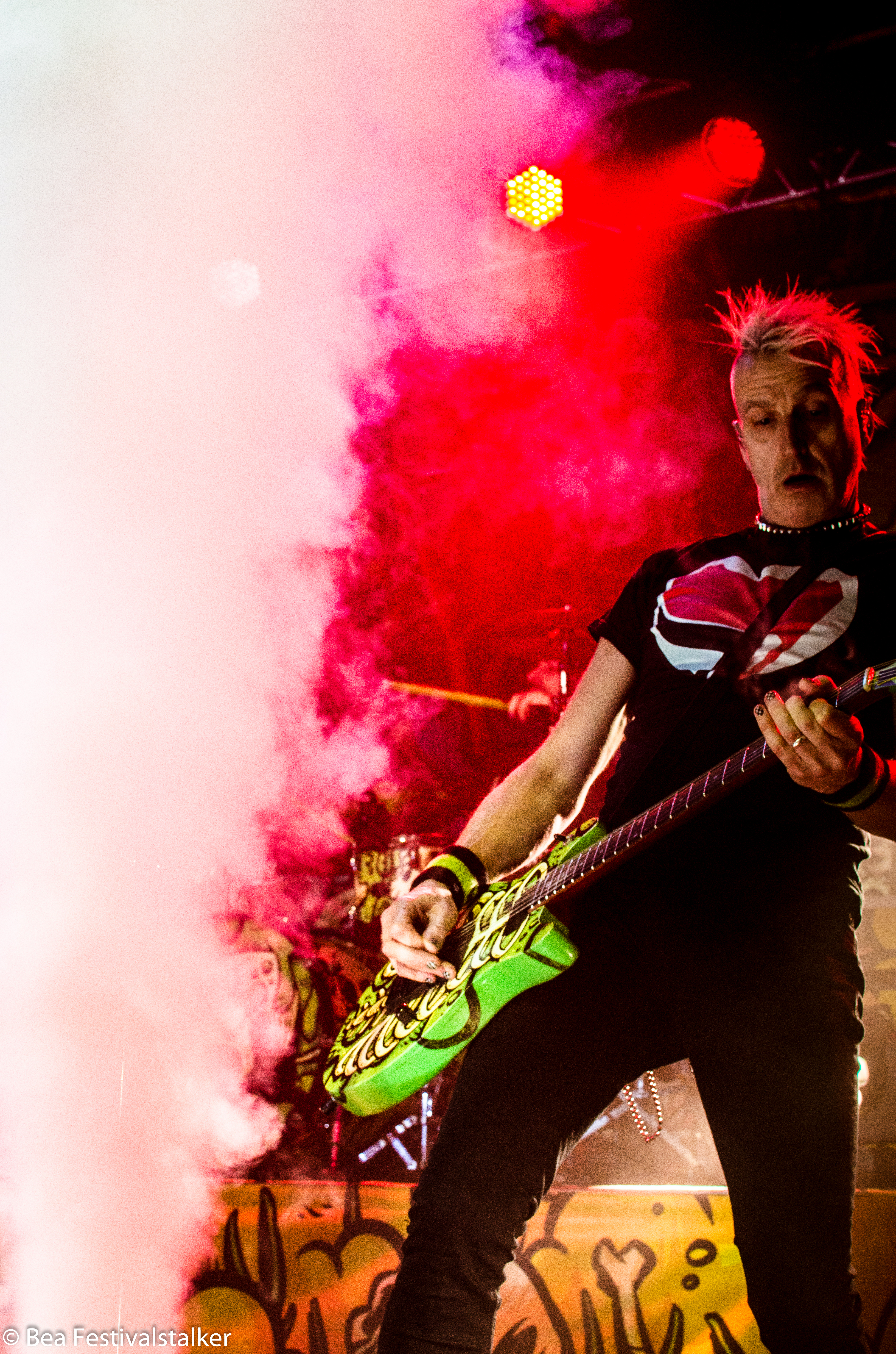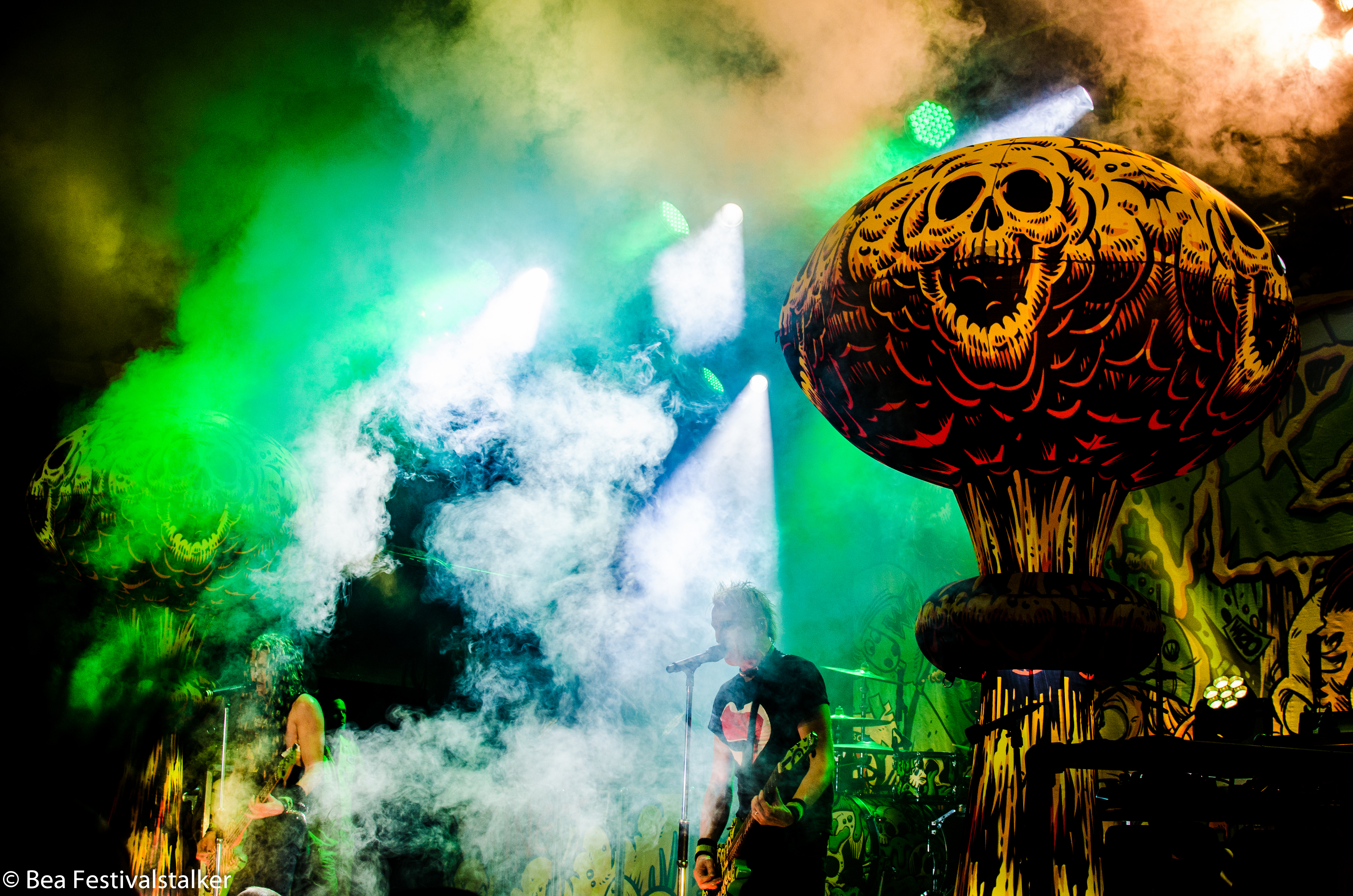 Neben diversen Effekten auf der Bühne freuten wir uns vor allem über das Bühnenbild. Während im Vordergrund zwei aufblasbare Atompilze im Takt der Musik wippten, erstrahlte das Bühnenbild im satten Neon Grün.