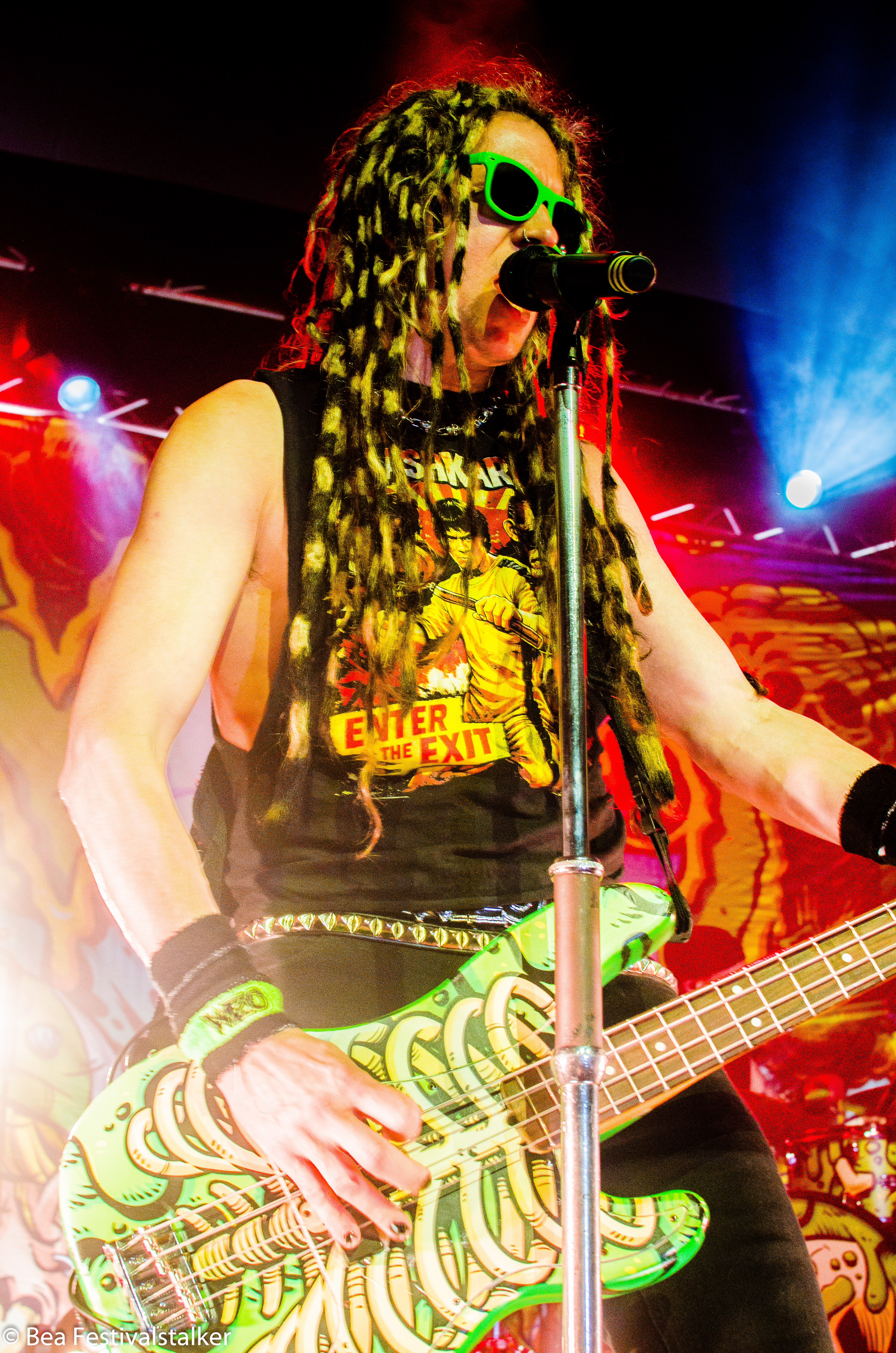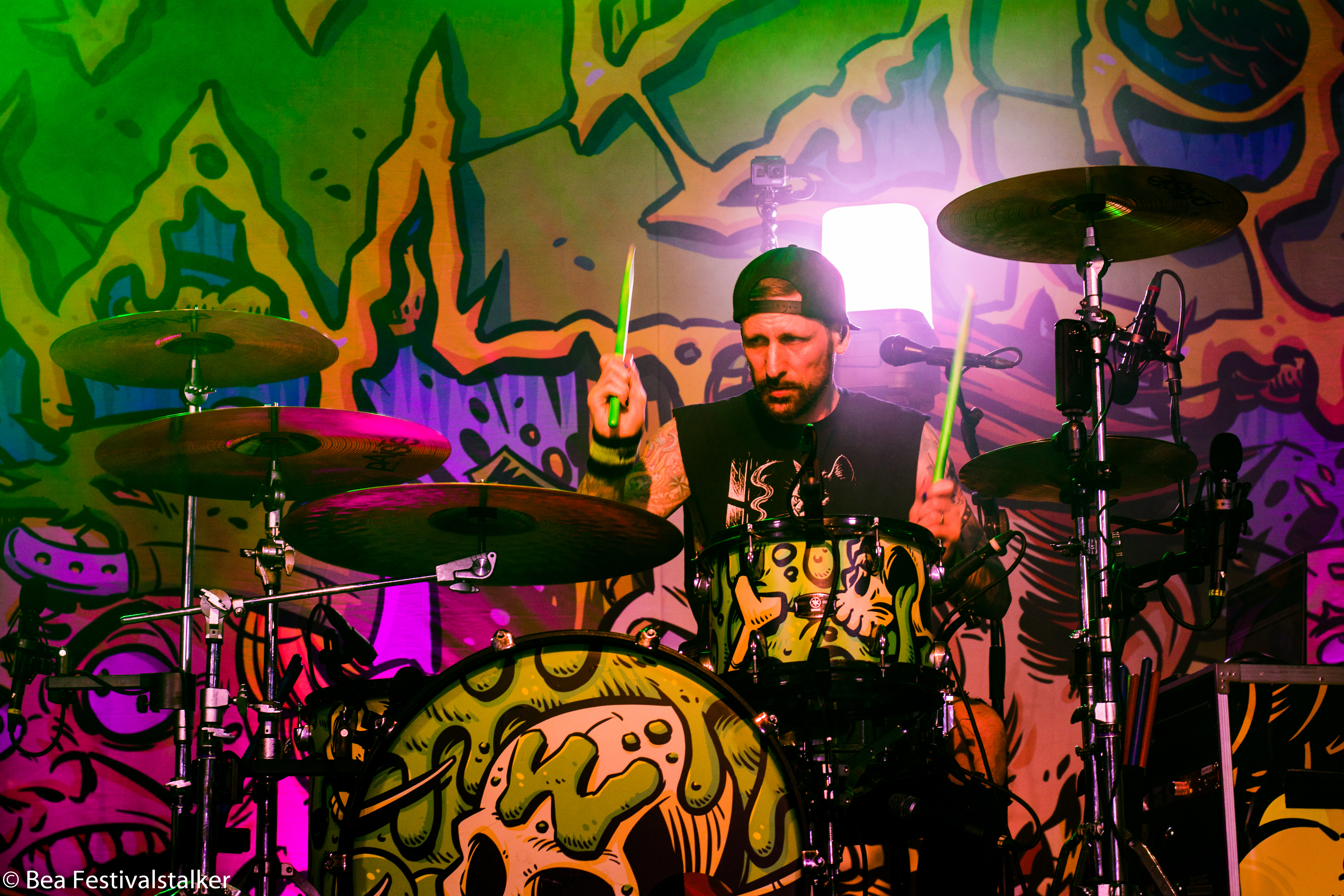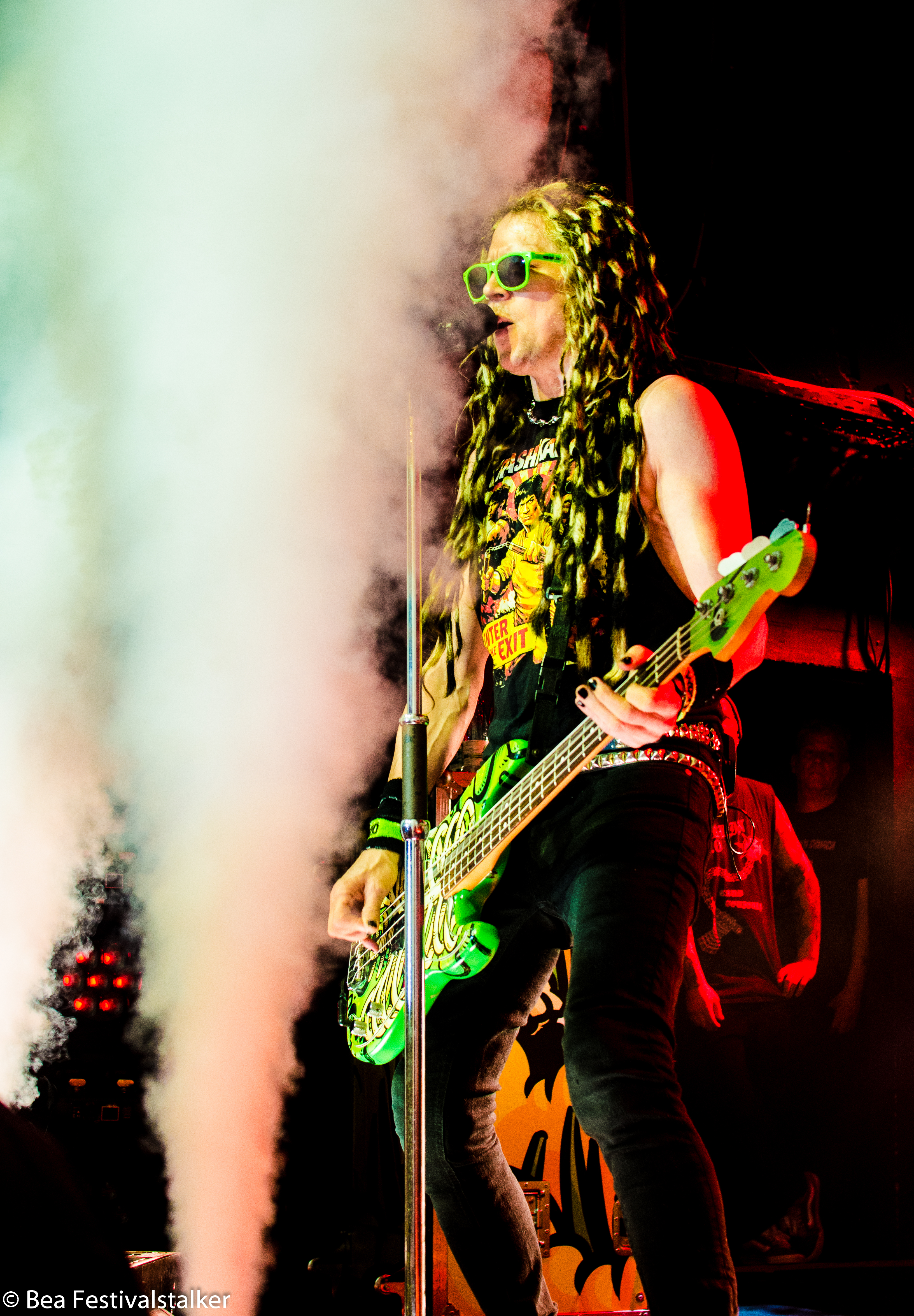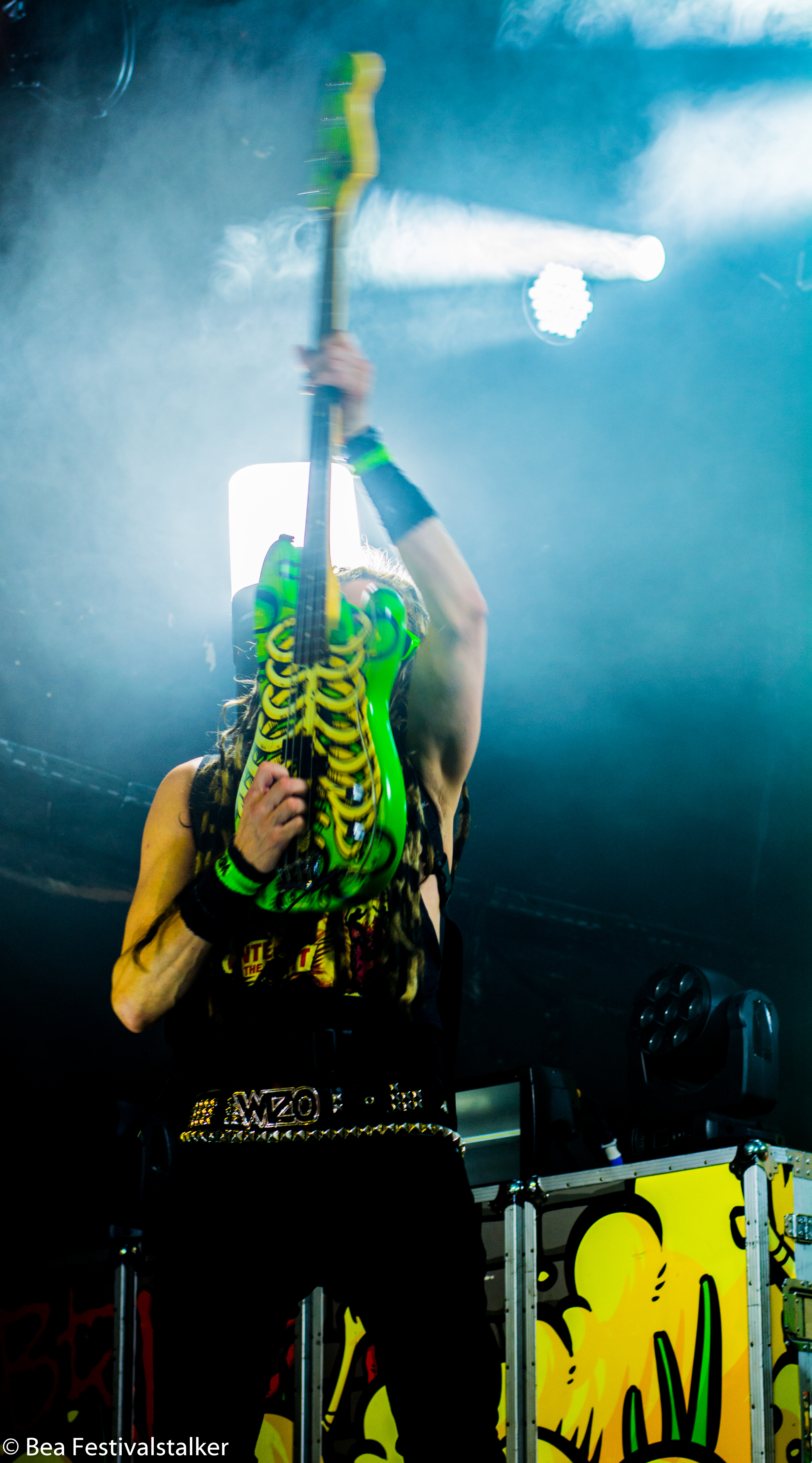 Neben diversen Effekten auf der Bühne freuten wir uns vor allem über das Bühnenbild. Während im Vordergrund zwei aufblasbare Atompilze im Takt der Musik wippten, erstrahlte das Bühnenbild im satten Neon Grün.