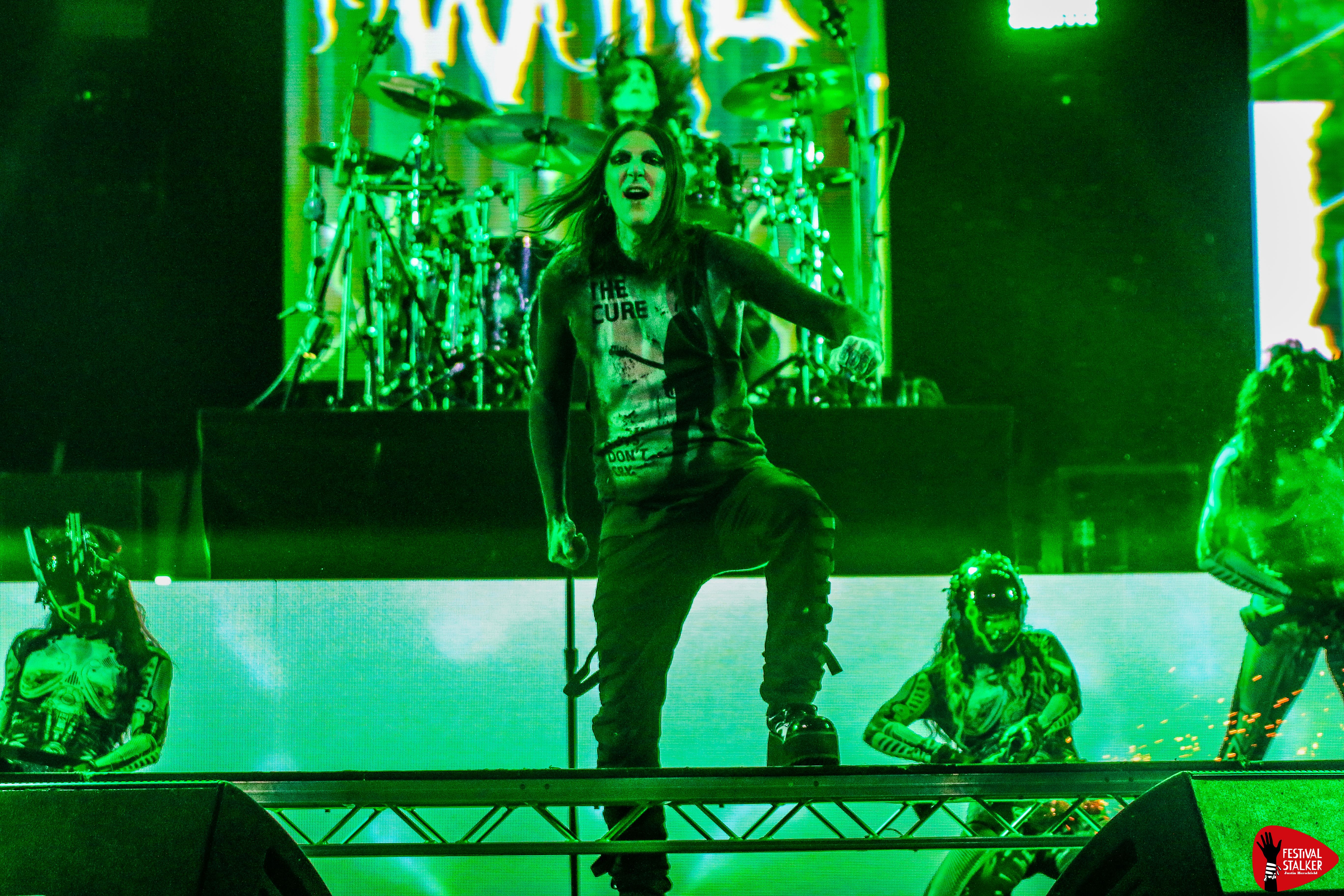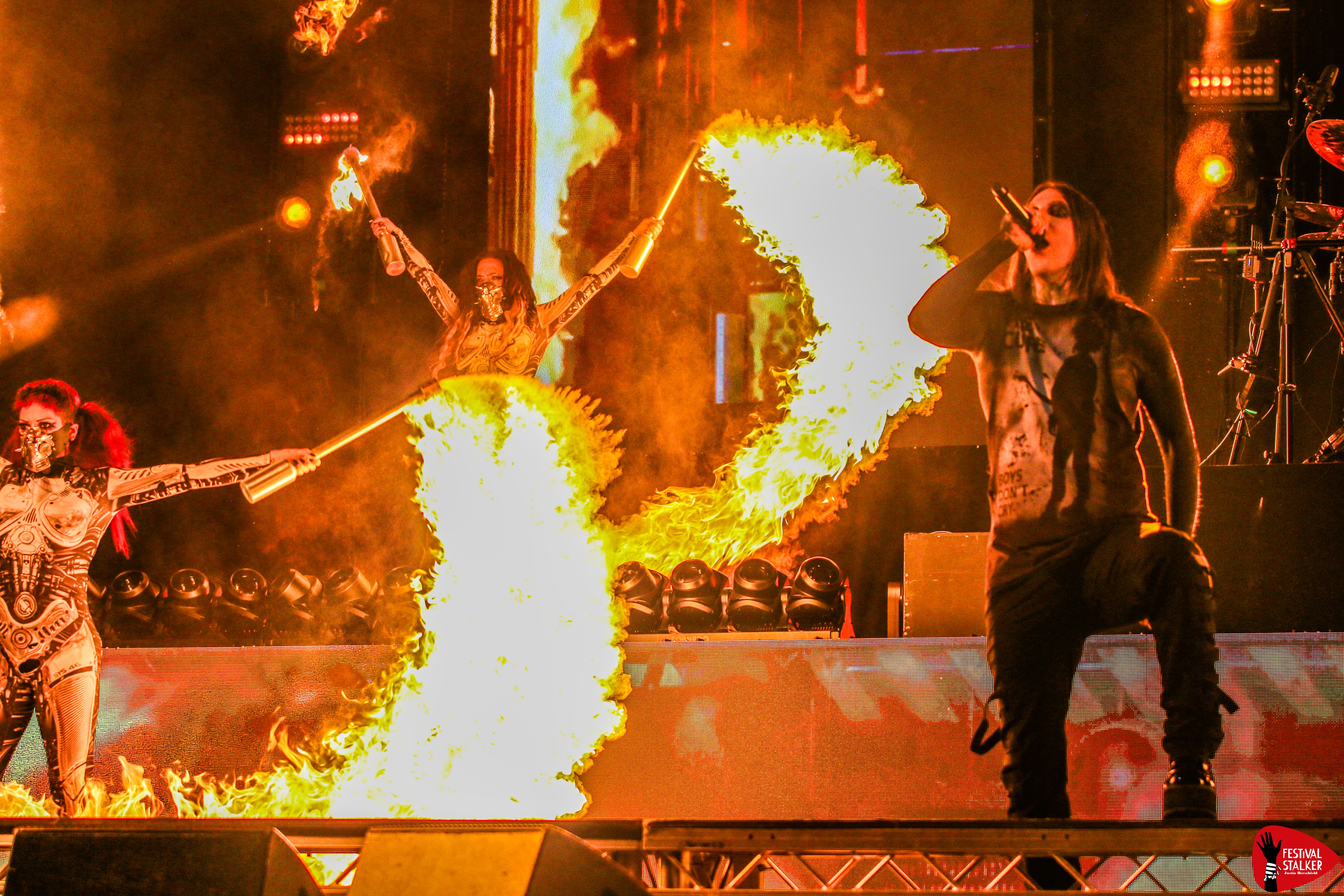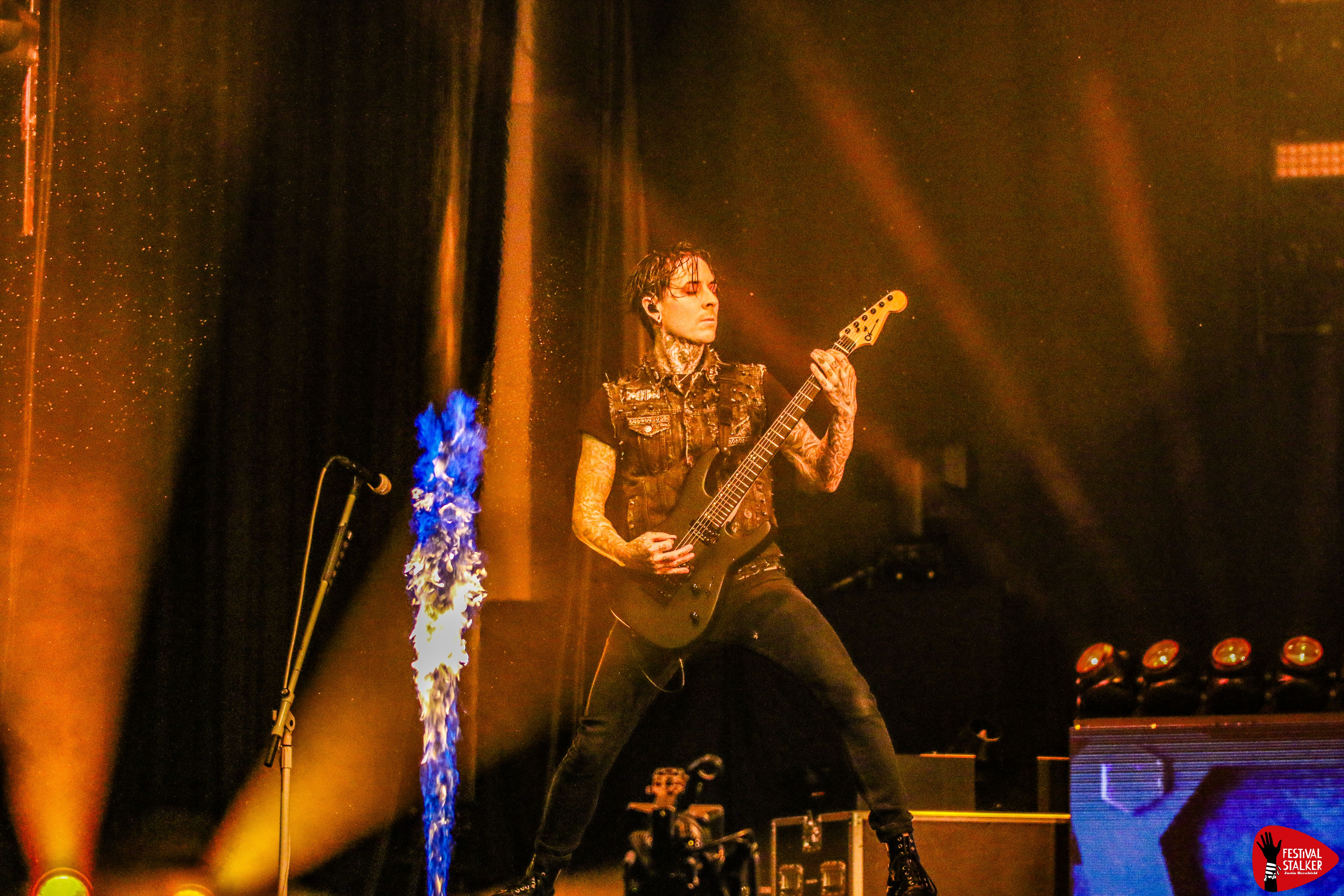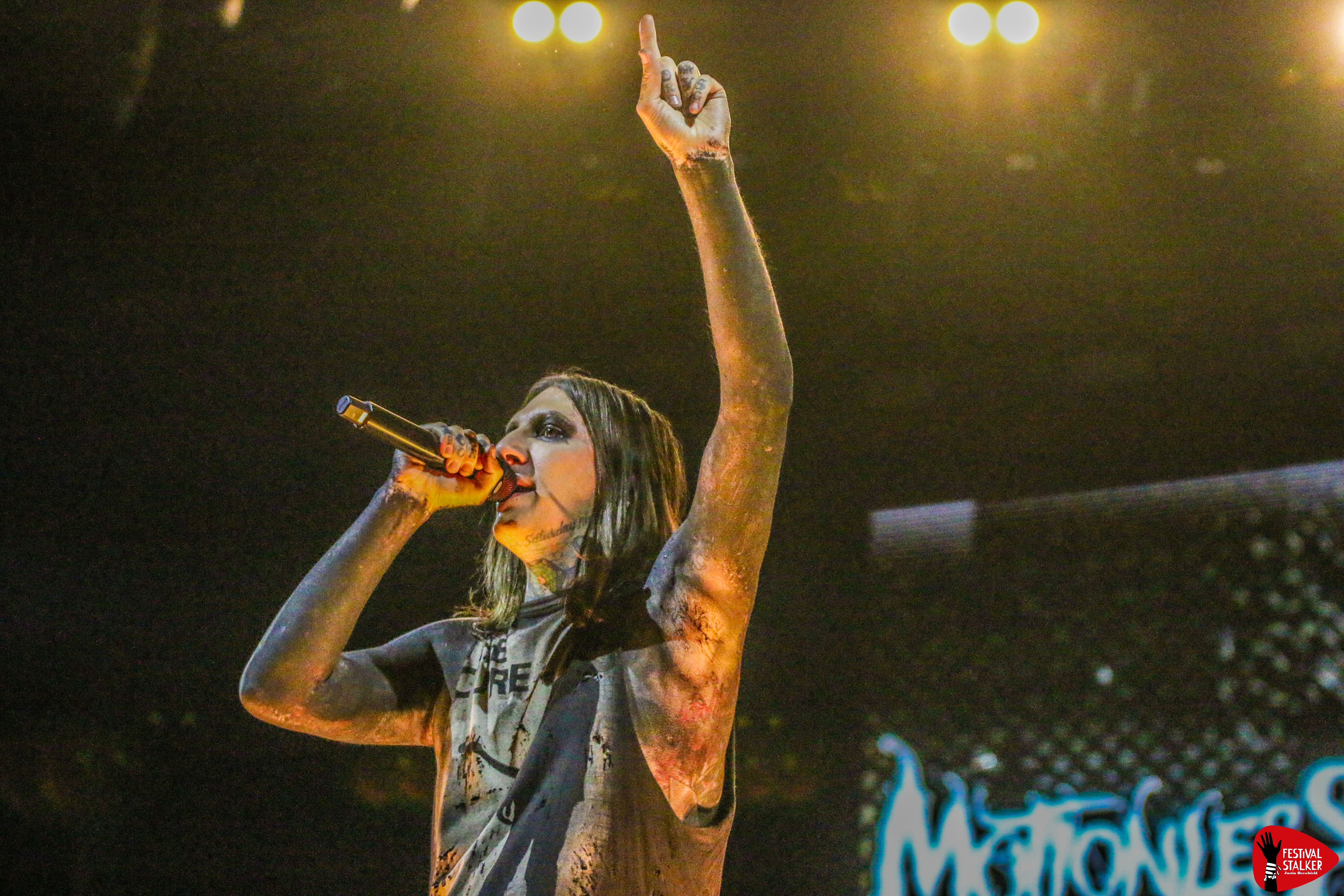 Schon mit dem brachialen Opener „Meltdown“ machten Motionless In White klar, wohin die Reise geht: kompromisslos nach vorne. Sänger Chris Motionless betrat unter tosendem Applaus die Bühne – ganz in Schwarz, umgeben von grellen Lichtblitzen, Pyro und einer imposanten LED-Show. Die Mischung aus Industrial-Elementen, donnernden Drums und eingängigen Refrains sorgte vom ersten Moment an für Moshpits und lautstarke Mitsing-Chöre.