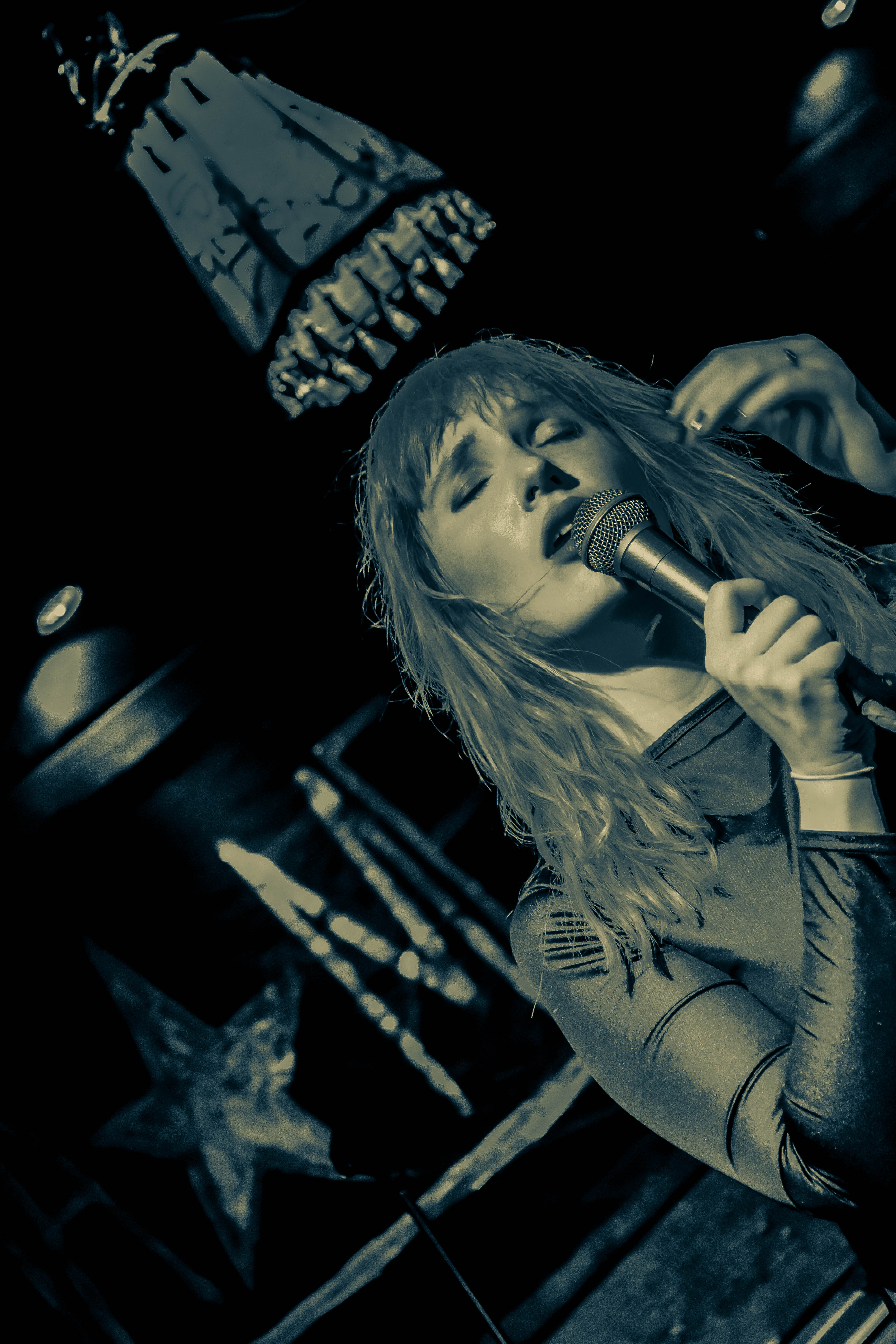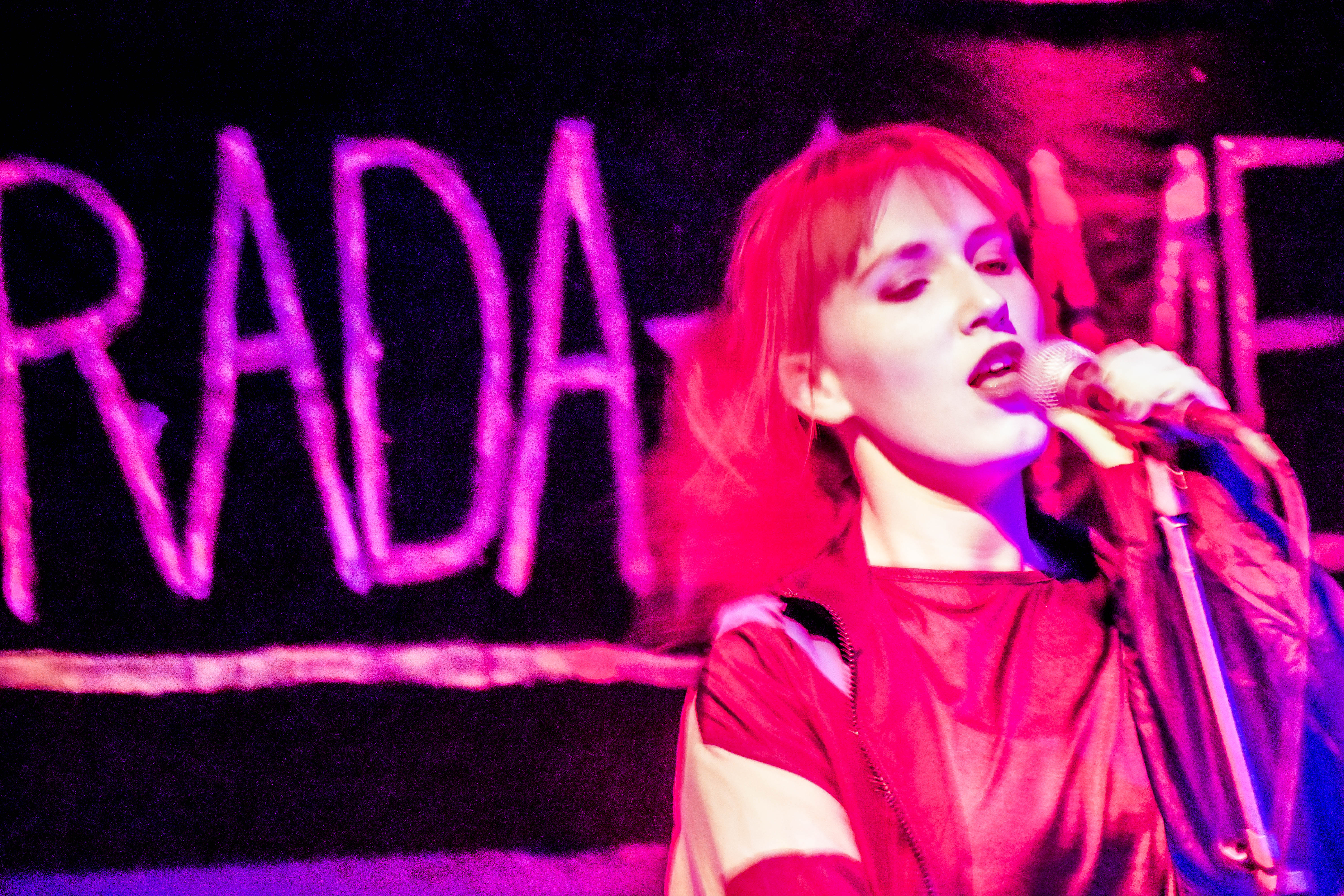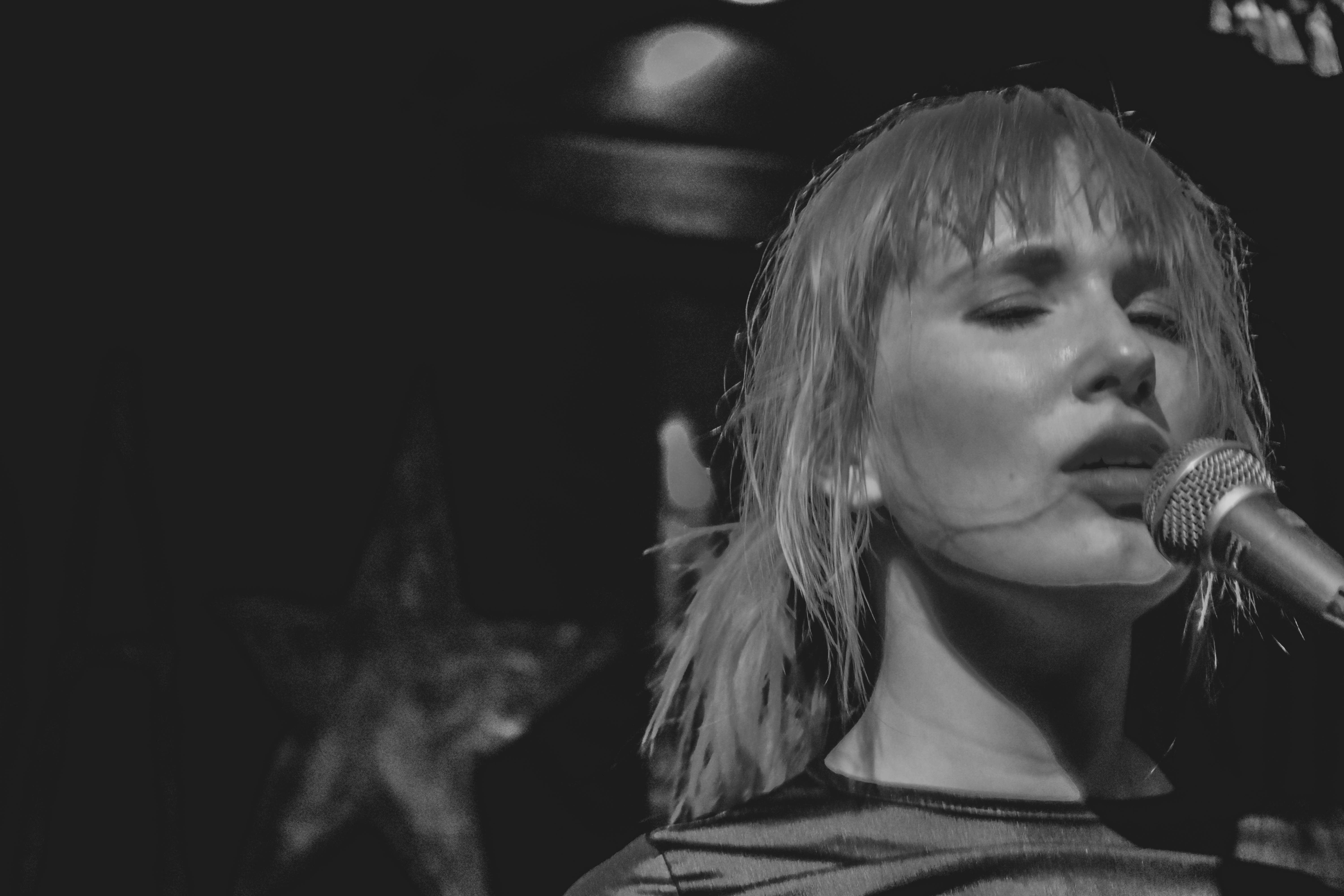 Der kleine Raum vor der Bühne ist voll. Tanzen geht trotzdem und vor allem die ersten Reihen bewegen sich lasziv zum Takt der Musik. Stampfende Bässe, dazu Chrissis klare Stimme und eine Bühnenshow, die mit den Bühnen-Lichtern spielt, die komplette Stage einnimmt und sich atemlos schwingt und wiegt. Das Duo wirbelt umher, ihre Songs rauschen durch die Menge wie ein kleiner Wind, der Blätter von der Straße aufwirbelt. Mich überrascht es, dass der Ton so gut ist, war er doch bei der Support-Band Snøffeltøffs teilweise falsch eingestellt – Vocals zu leise, Instrumente zu laut.