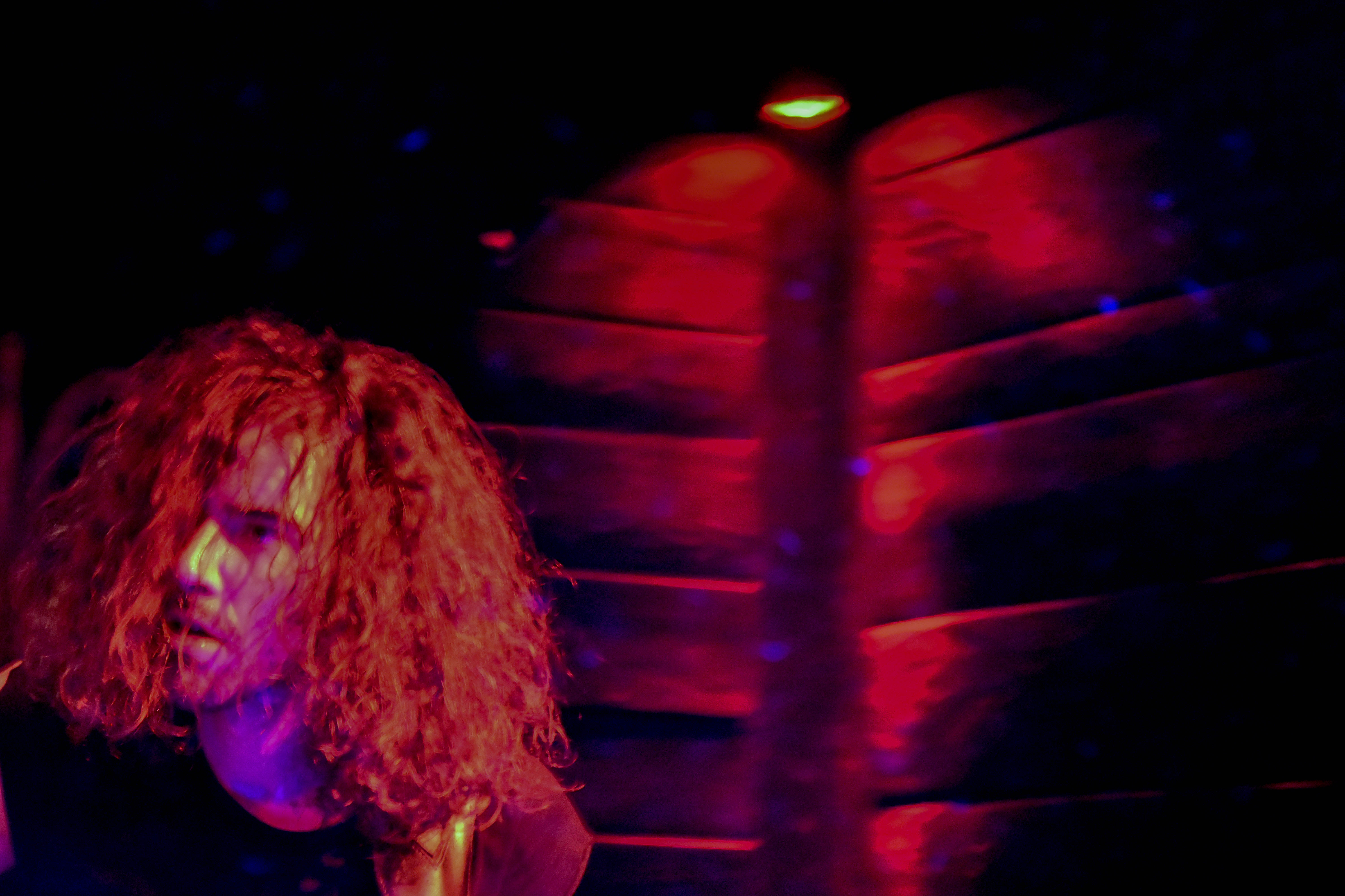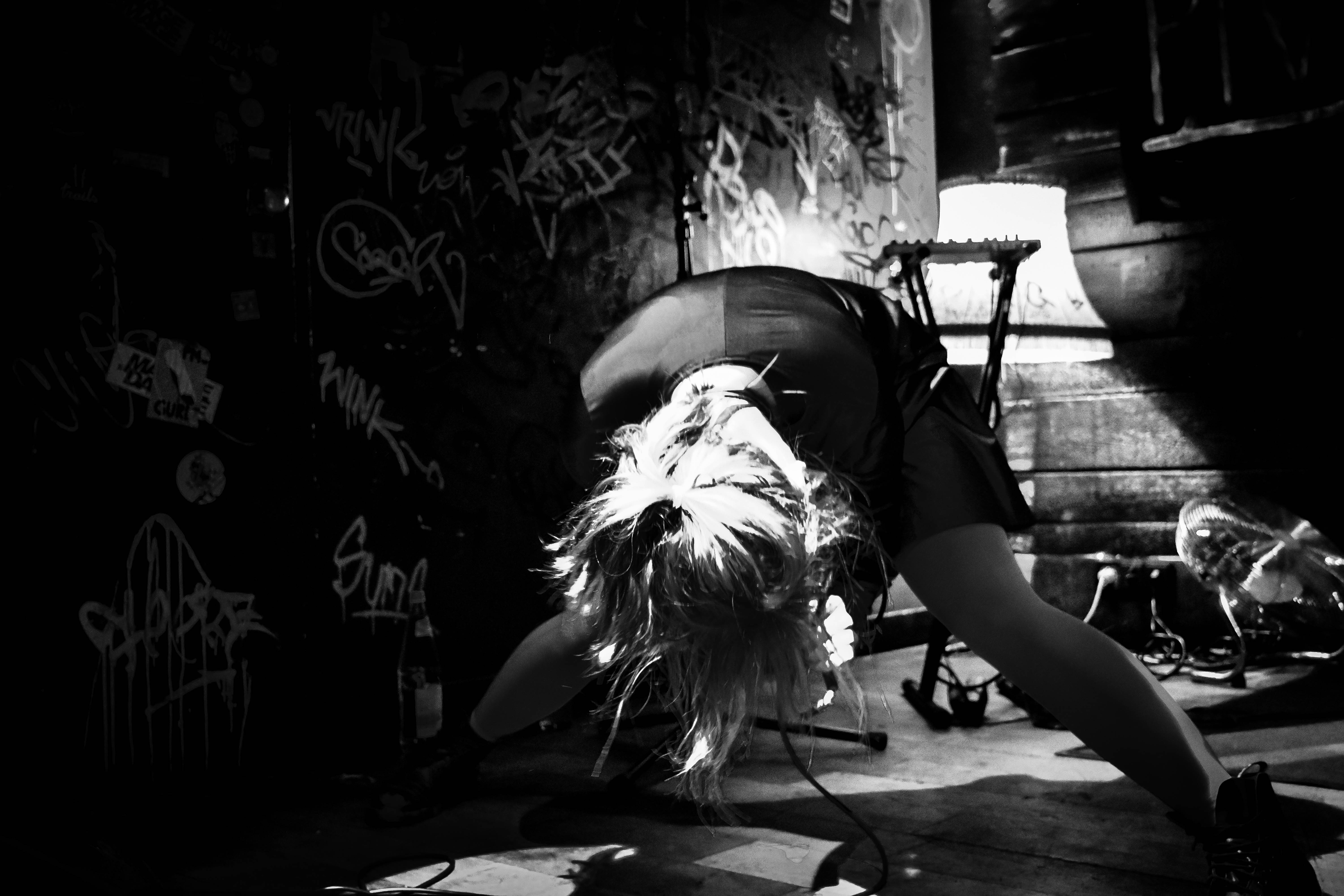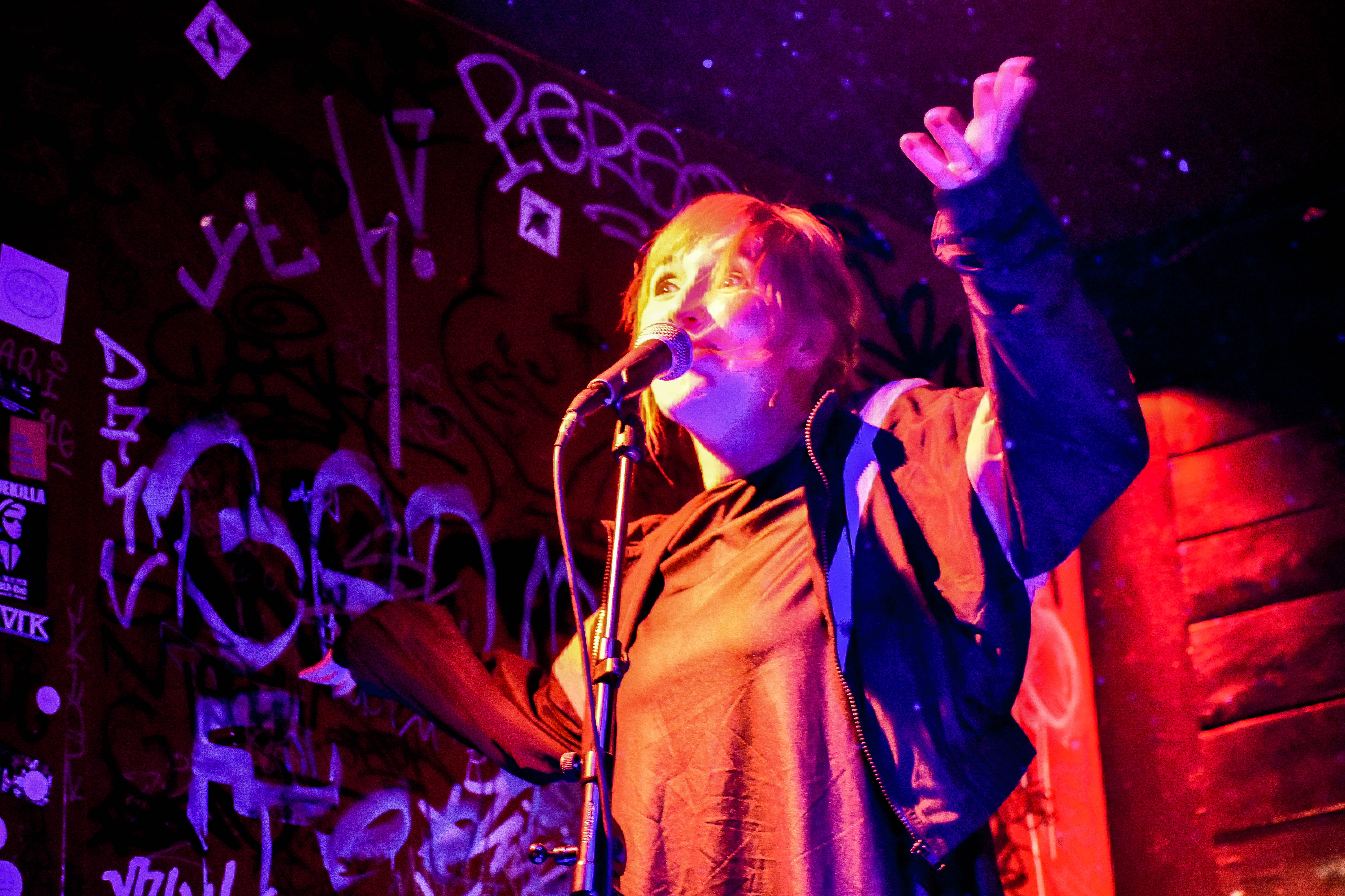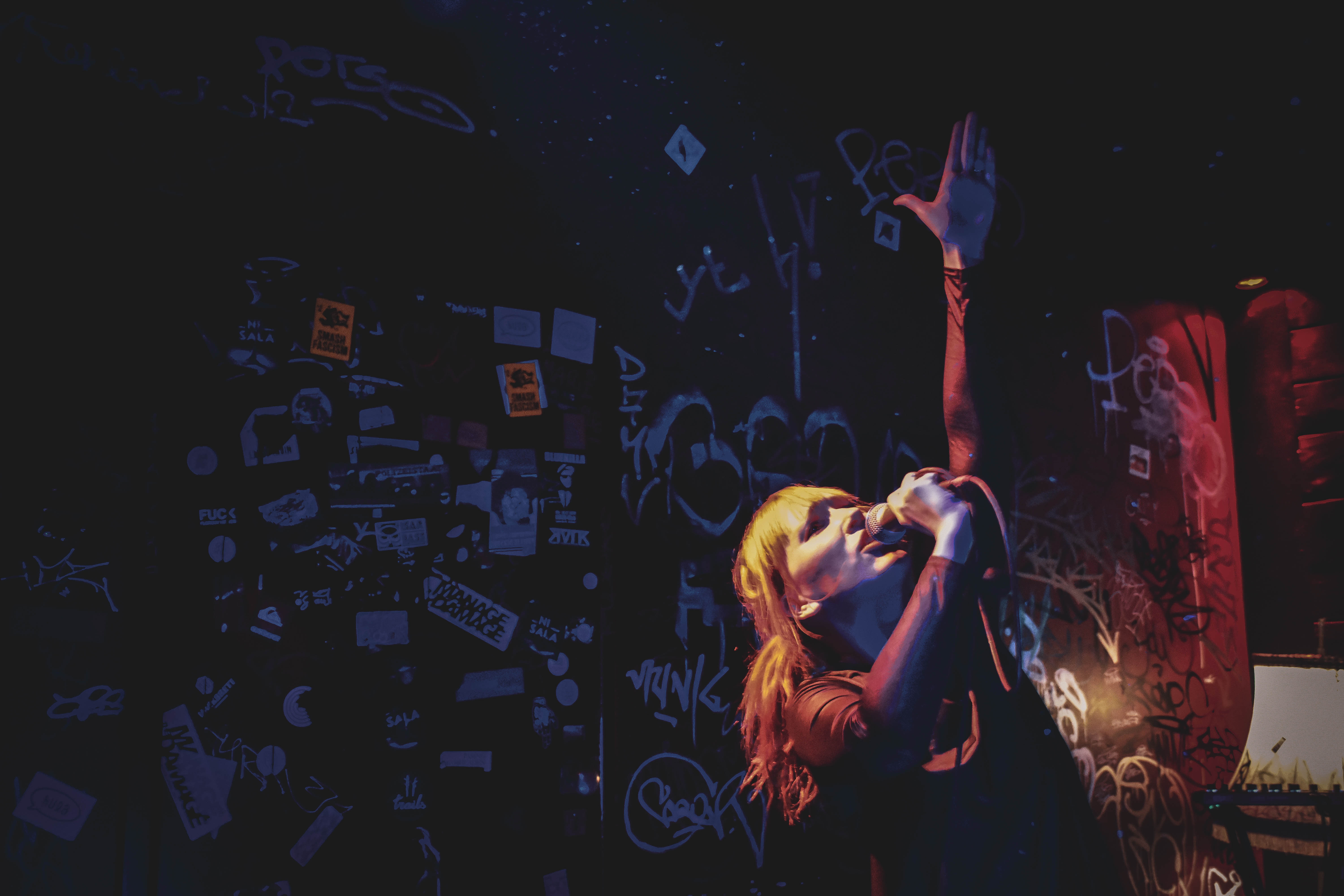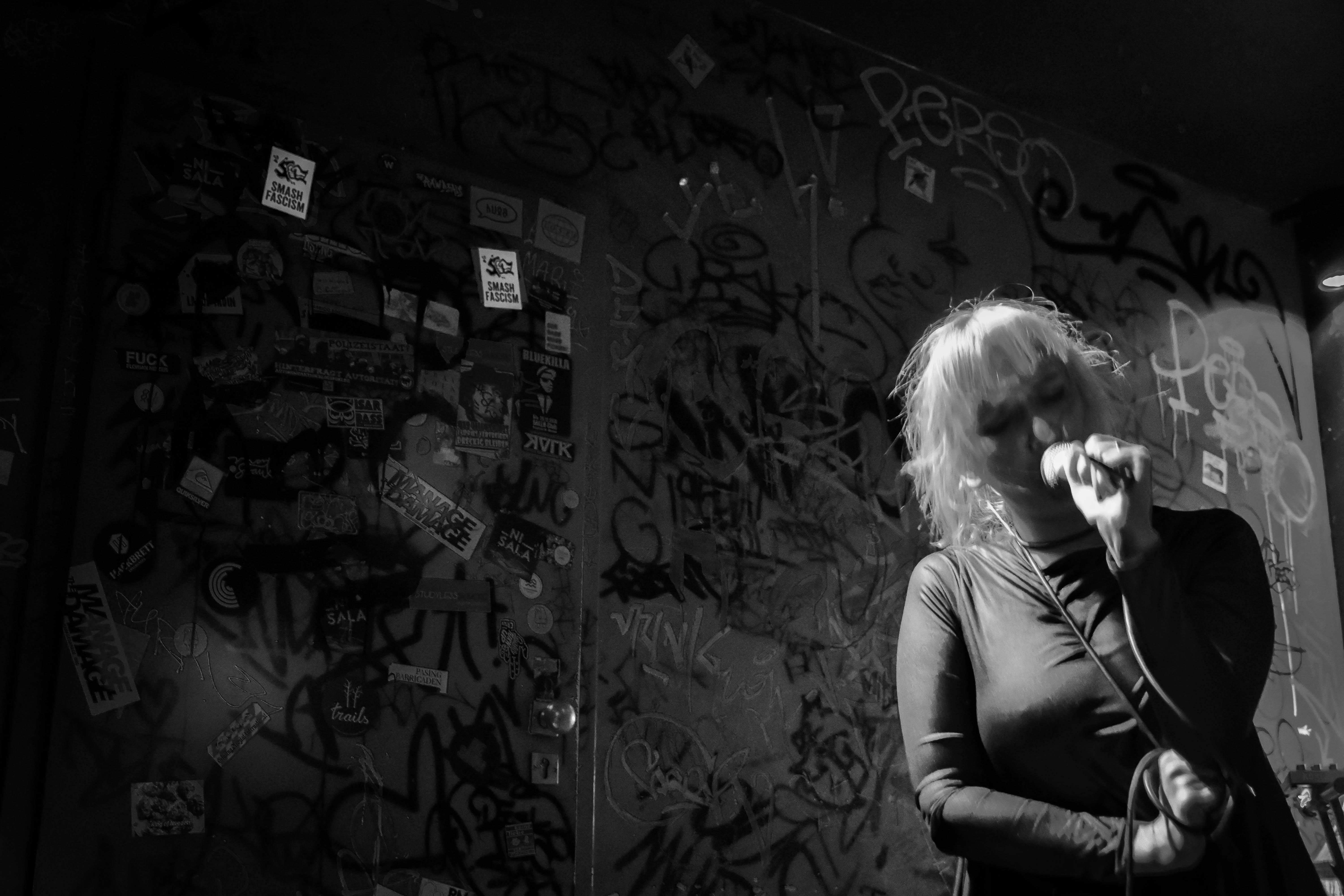 Genial ist, wie der kleine Raum, in dem sich das Konzert abspielt, mit der Band verschmilzt. Die vollgemalten, vollgekritzelten Wände im dreckigen Rot und Schwarz – ein bisschen verschmuddelt, abgeranzt – einfach perfekt passend zu den anprangernden Songs.
