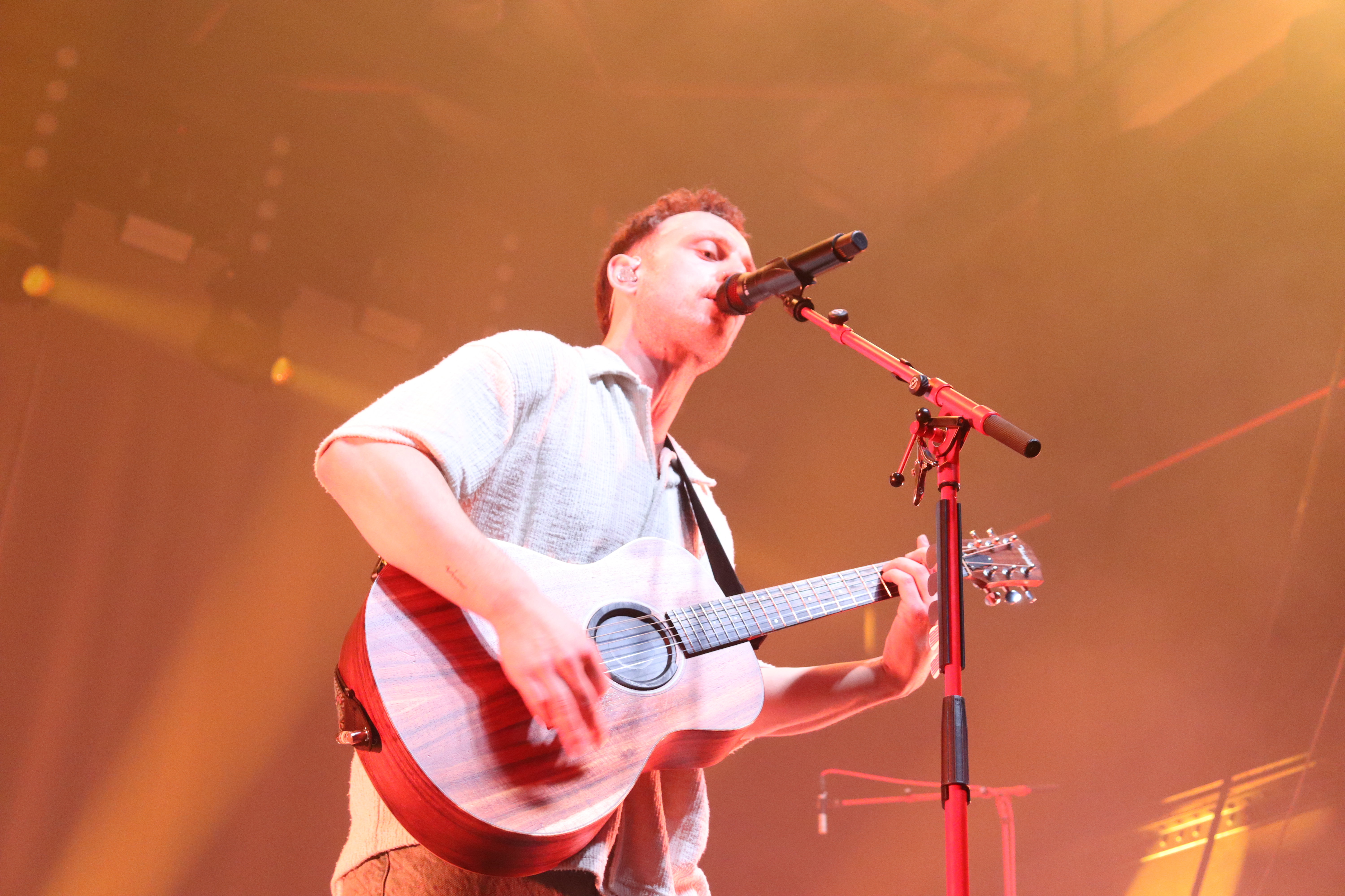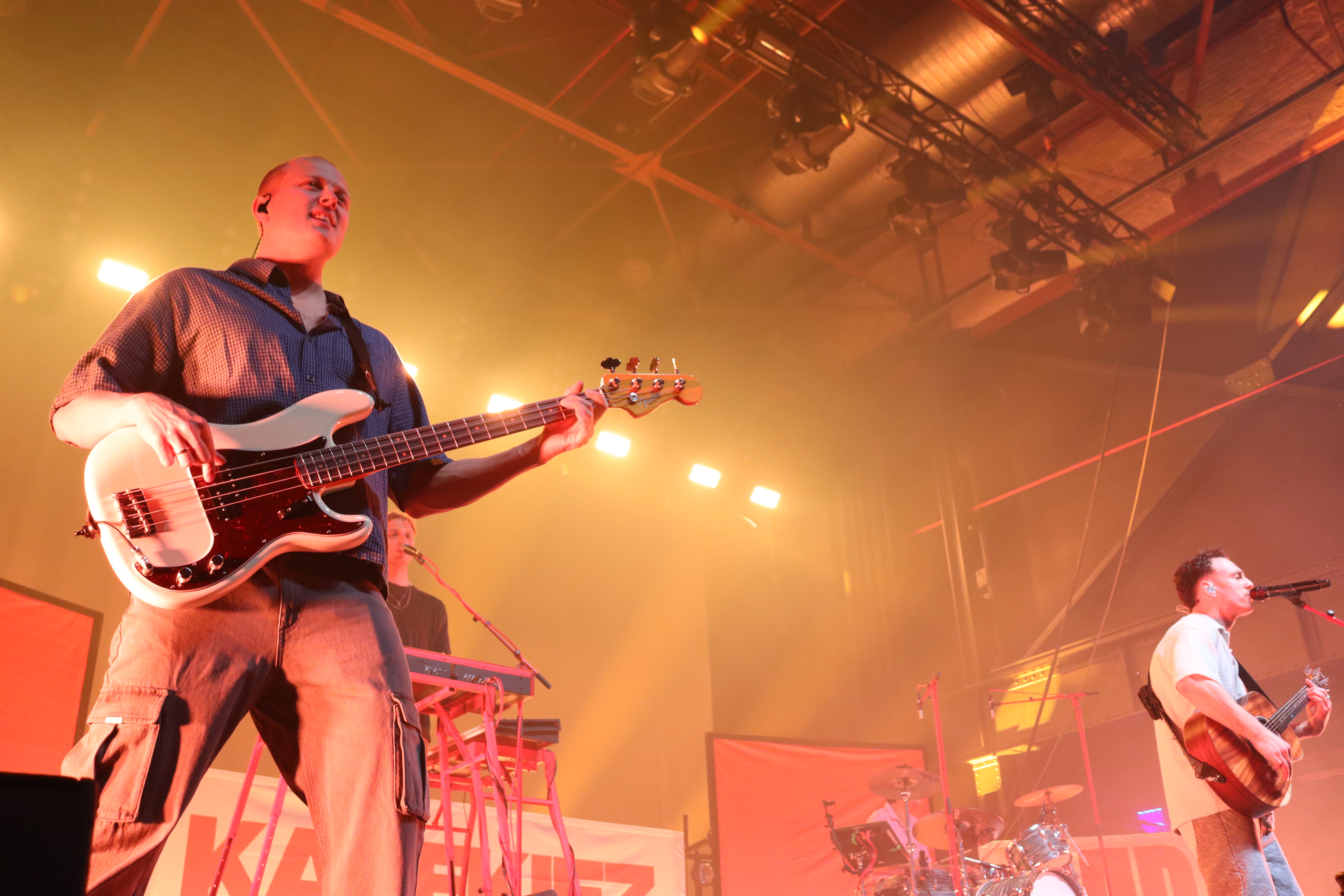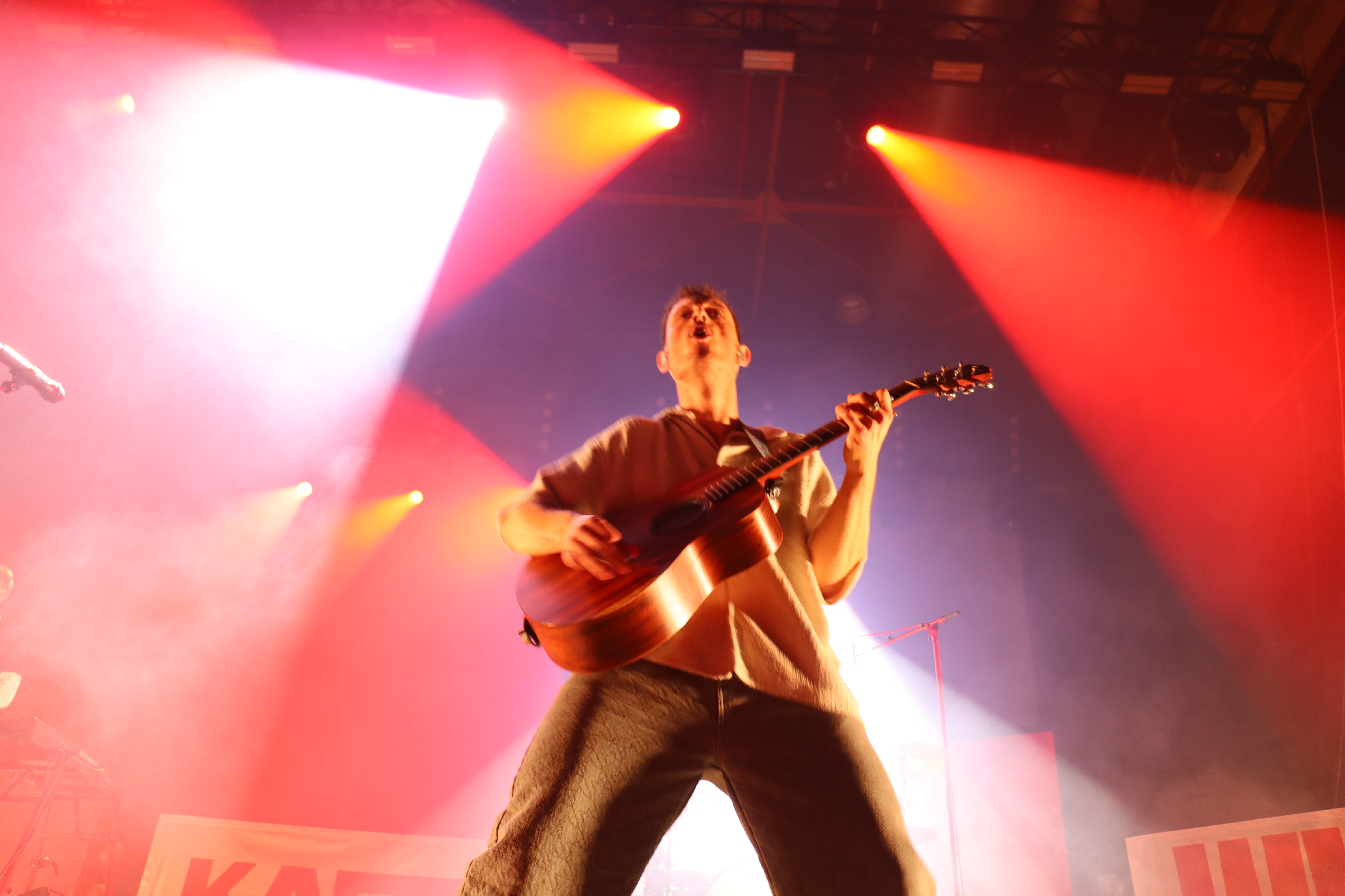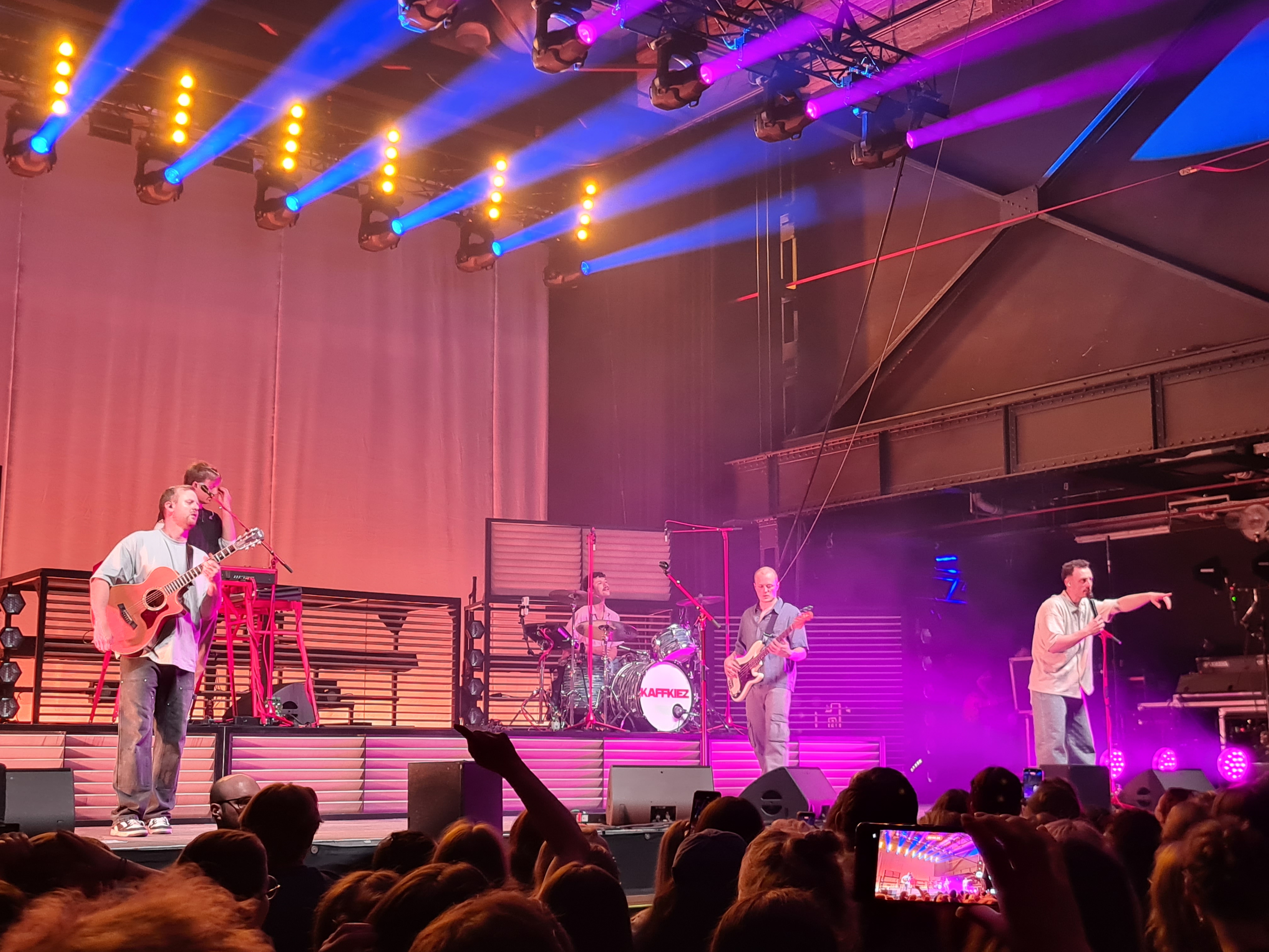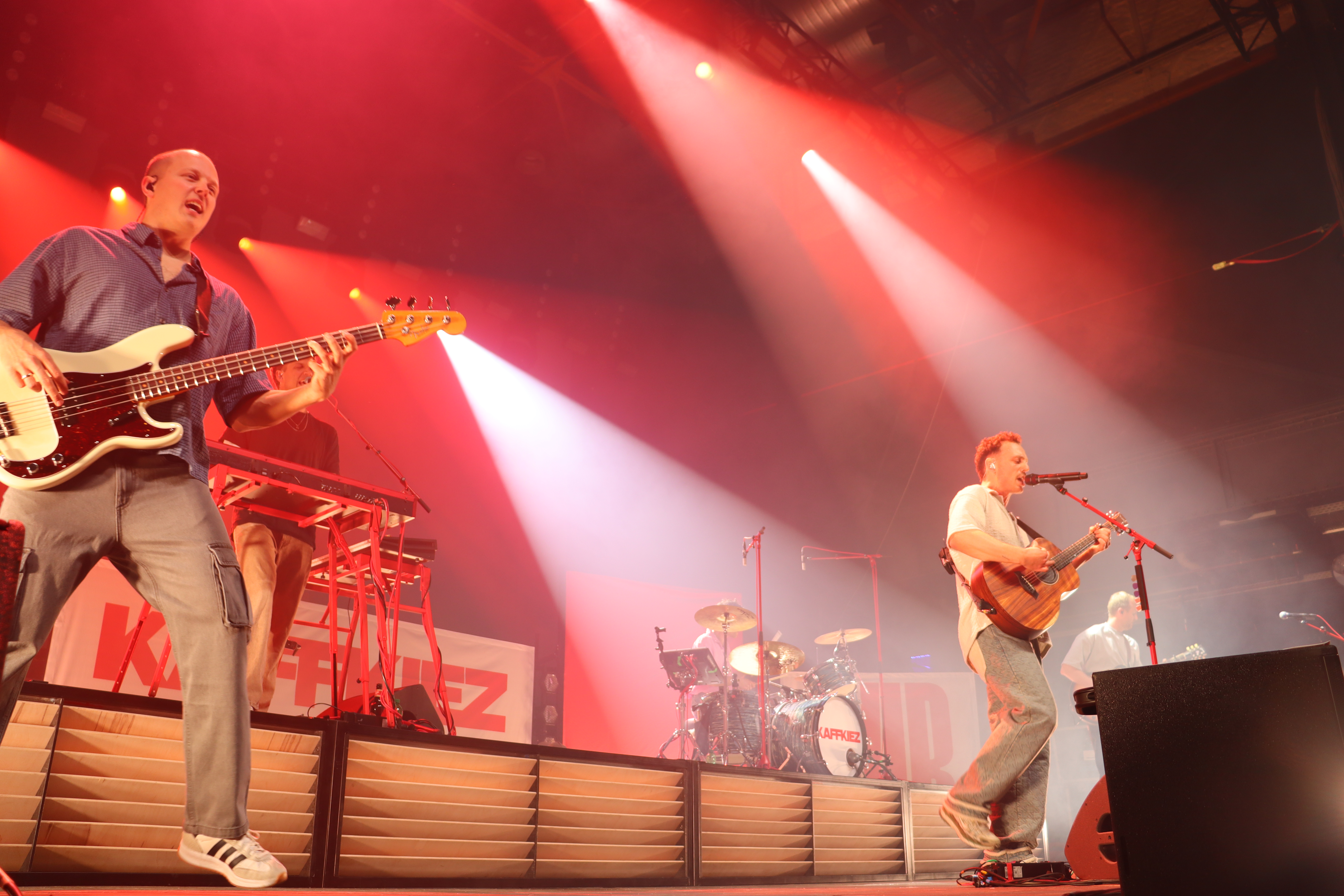 Als Kaffkiez schließlich die Bühne pünktlich 21Uhr betraten, gab es kein Halten mehr. Vom ersten Song an zeigte sich, warum die Band aktuell größere Hallen füllt. Nähe zum Publikum, ehrliche Emotionen und eine Dynamik, die sofort überspringt. Frontmann Johannes Eisner führte mit spürbarer Leidenschaft durch das Set und suchte immer wieder die direkte Interaktion mit den Fans.