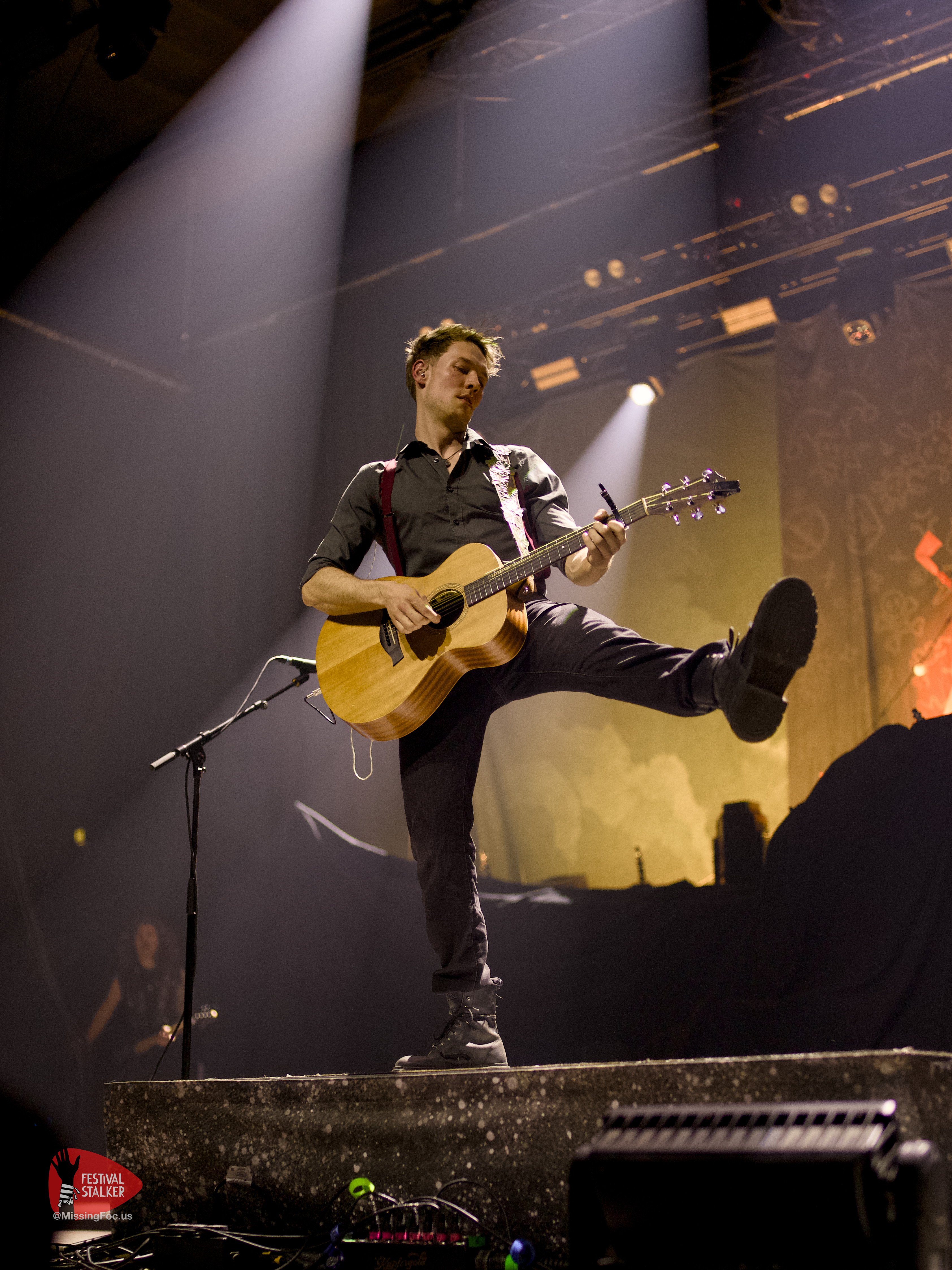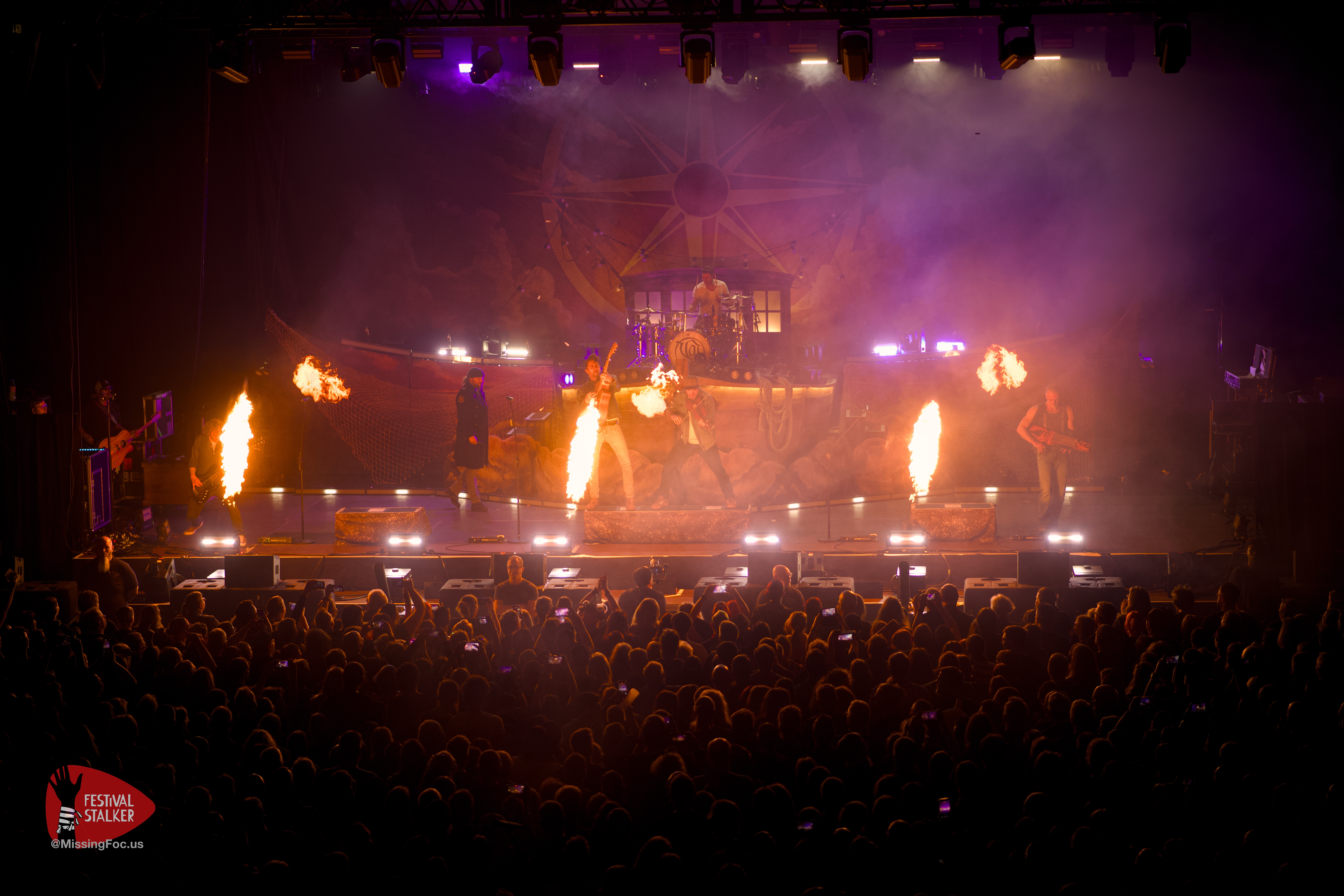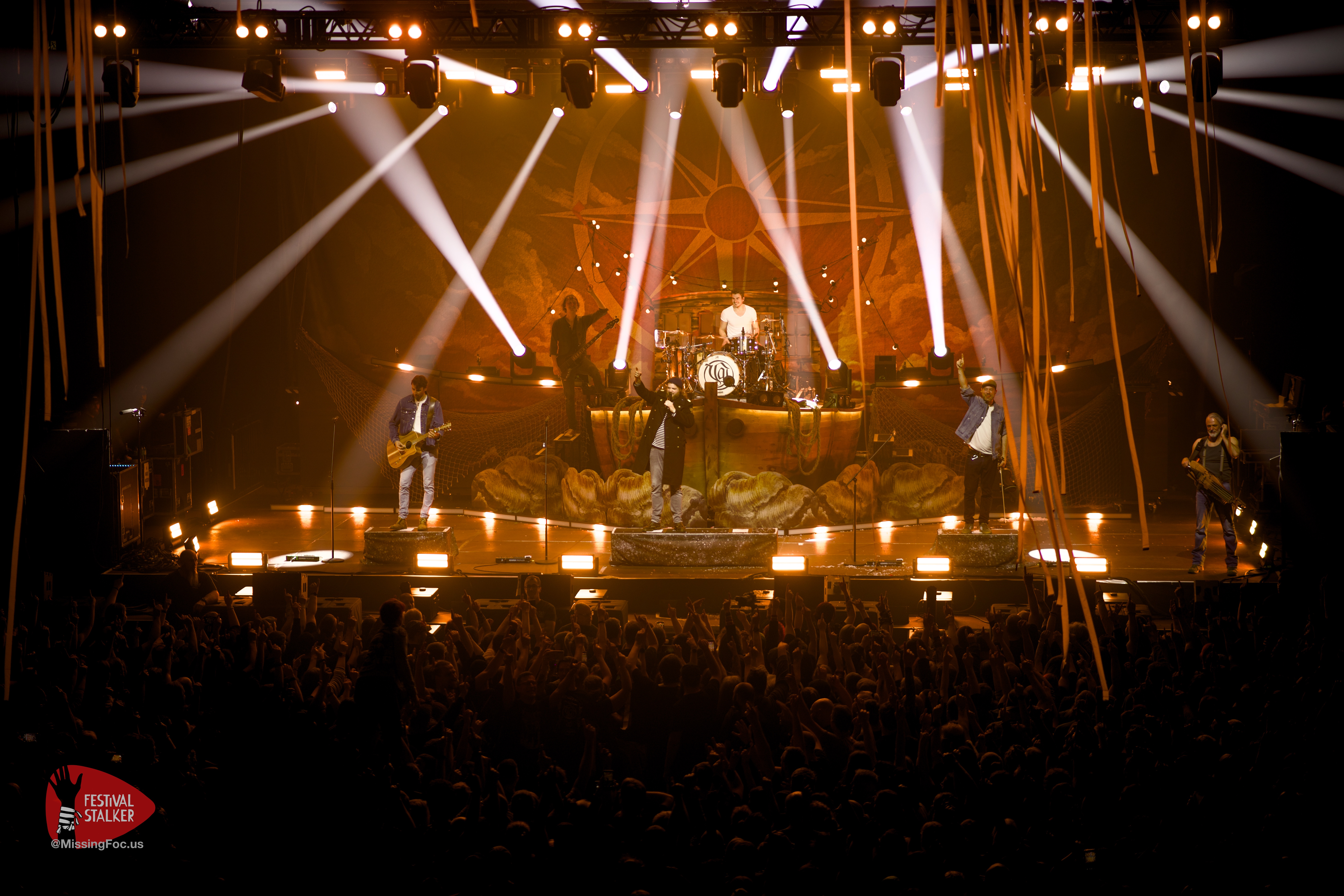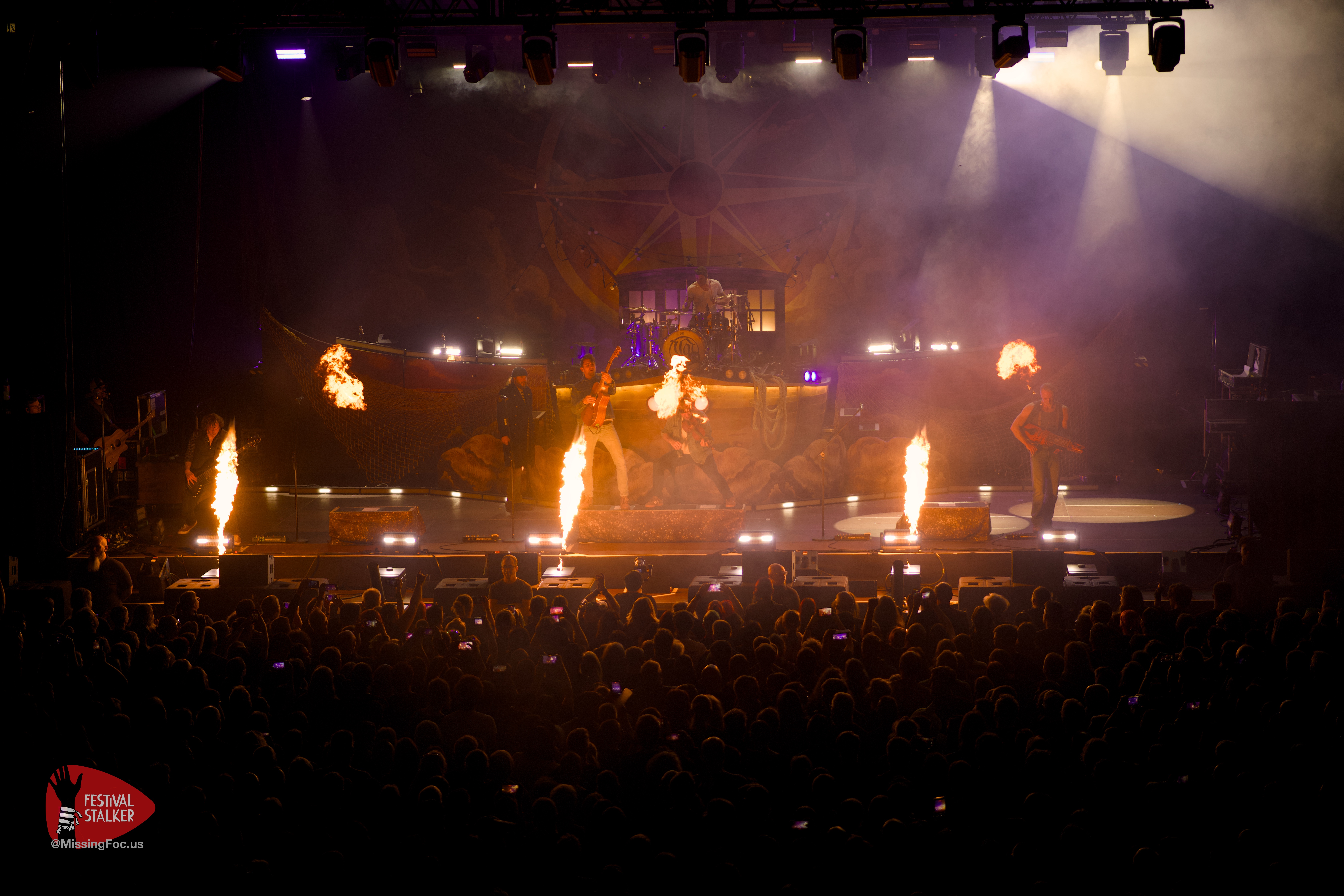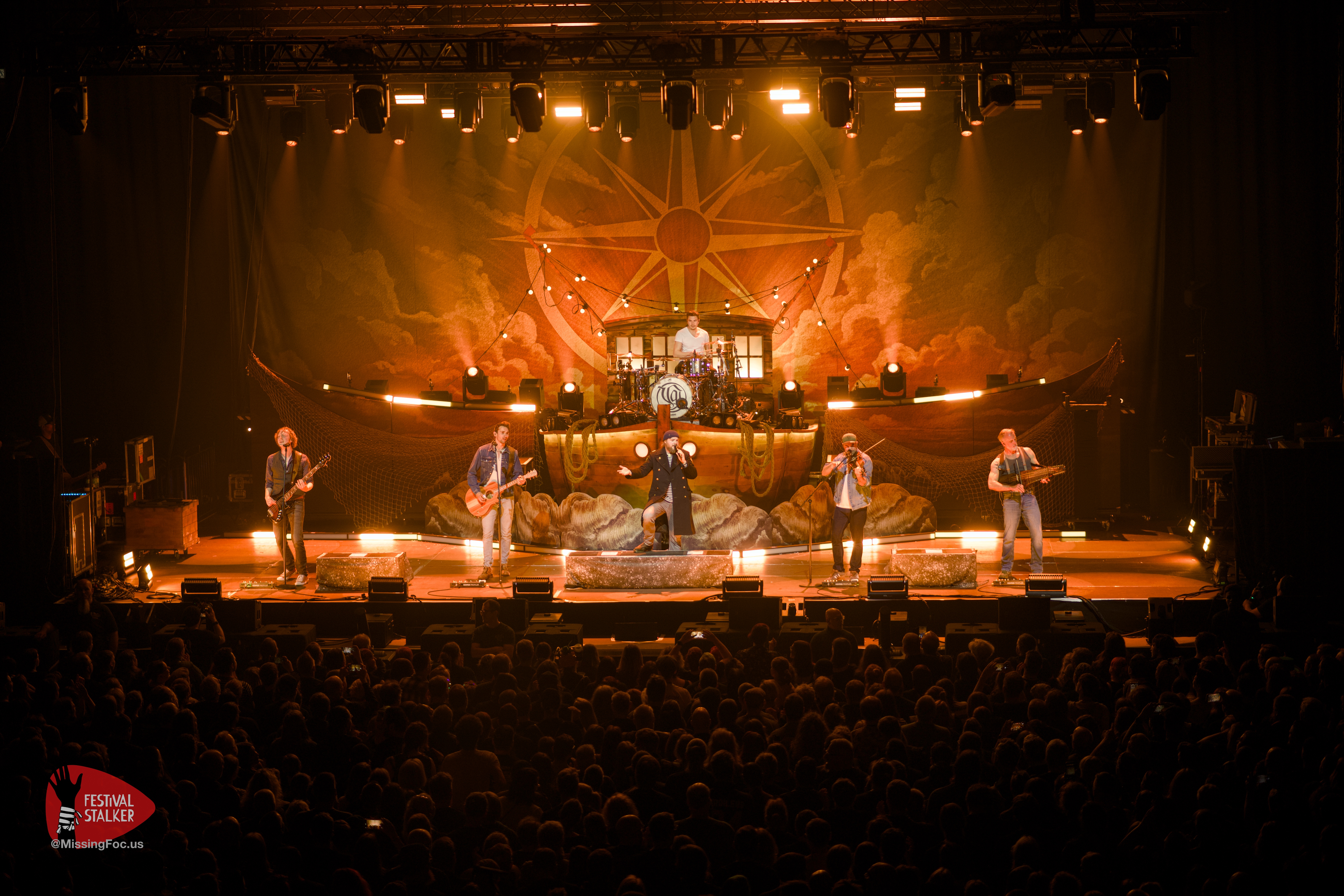 Feuer und Versengold gehören einfach zusammen, die Flammenprojektoren kamen immer wieder zum Einsatz. Auch ein kleines Lagerfeuer wurde zu dem Song „Krug voll Mondschein“ auf die Bühne gefahren. Generell wurde mit special effects nicht sparsam umgegangen. Der ein oder andere Fan wird definitiv Konfetti mit nach Hause genommen haben. Der erste kleine Moshpit entstand beim Song „Feuergeist„. Generell war Hannover sehr bewegungsaktiv. Spätestens bei „Niemals Sang und Klanglos“ hielt es niemanden mehr auf den Sitzen und es wurde überall getanzt. Zu „verliebt in eine Insel“ und „Erde“ haben sich Sänger, Gitarrist und die erste Geige auf eine Insel mitten im Parket zusammengefunden. Umringt von den Fans aus Hannover spielten sie zwei Songs auf dieser Insel.